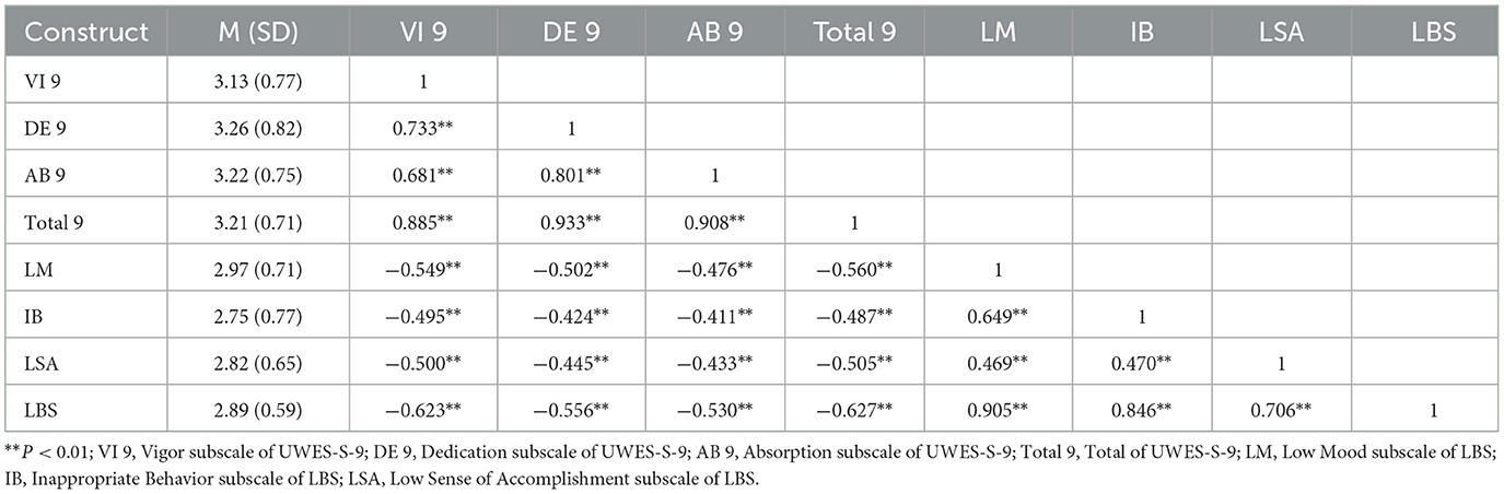 Factor distinctiveness between UWES-S-9 dimensions was evaluated through examination of factor correlations, average variance extracted (AVE), and shared variance between factors (Fornell and Larcker, 1981). Standard factor loadings were required to exceed 0.50 and remain below 1.0 (Hair et al., 2010). Factor distinctiveness validity was supported when the AVE of each factor exceeded the shared variance with other factors, indicating that factors capture more unique variance than shared variance with other constructs.