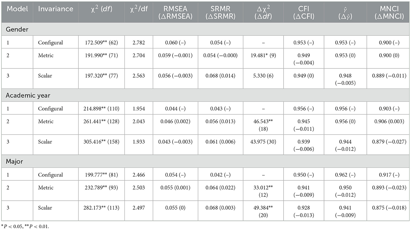 Multigroup CFA was conducted to assess the measurement invariance of the UWES-S-9 across gender, academic year, and major. Results as shown in Table 8 indicated that the changes in model fit indices of the ΔRMSEA, ΔSRMR, ΔCFI, , and ΔMNCI between configural and metric, and metric and scalar were no more than the cutoff values of 0.015, 0.03, 0.01, 0.008, 0.02, respectively (Chen, 2007; Kang et al., 2016), supported configural, metric, and scalar invariance, indicating that the scale's structure, factor loadings, and item intercepts are equivalent across these demographic groups. This establishes the UWES-S-9's validity for meaningful comparisons of academic engagement levels between genders and across different academic years and majors.
