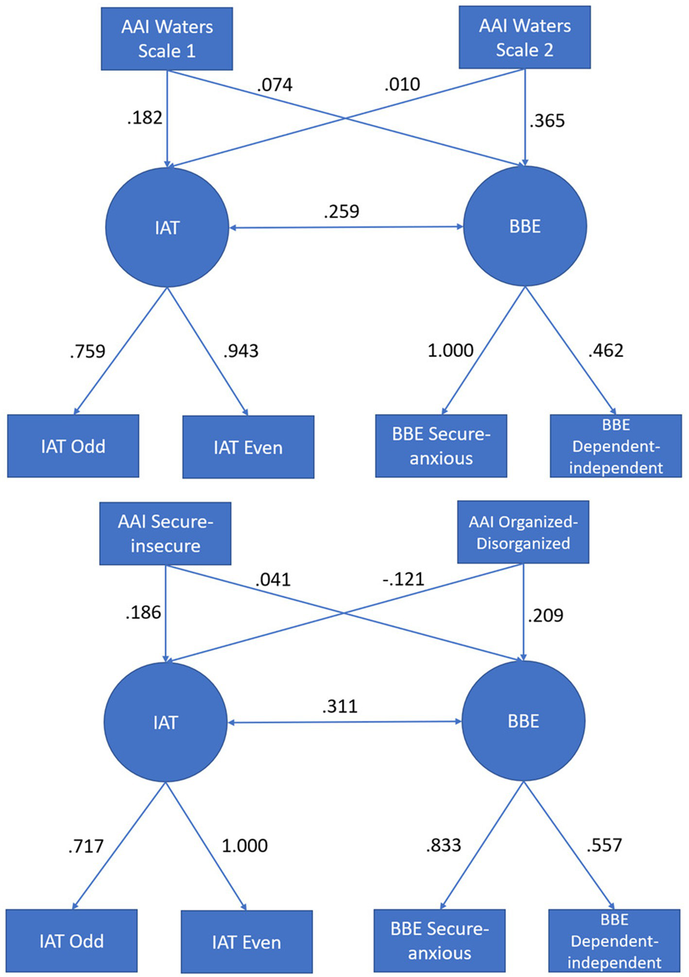 The tested measurement models with standardized parameter estimates. IAT, Implicit Association Test; BBE, Relationship-specific binding scales; AAI, Adult Attachment Interview; odd, odd IAT trials; even, even IAT trials.