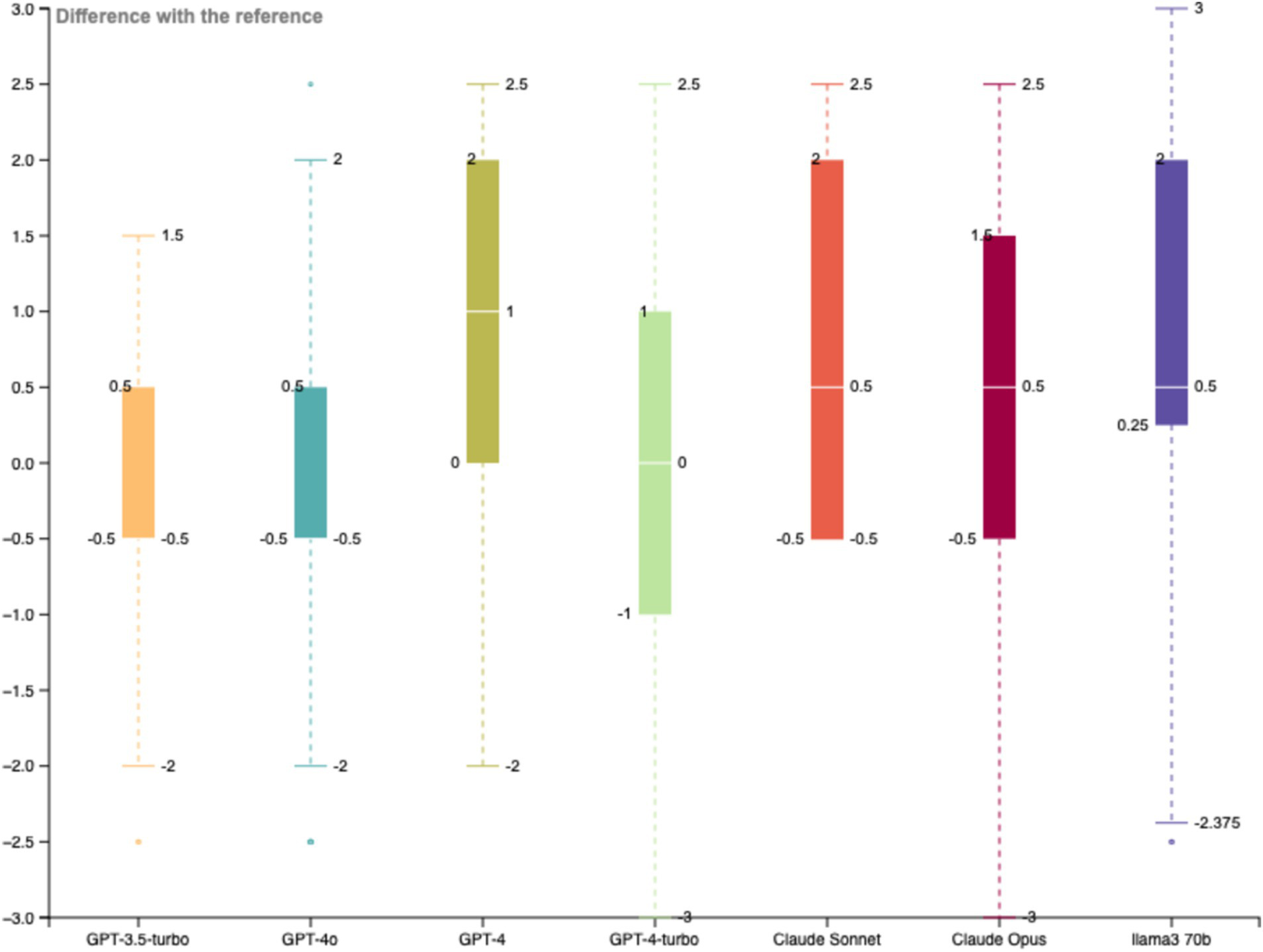 A variability analysis has been carried forward comparing the distribution of the differences of each LLM with respect to the expert scoring. The lower variability has been observed with GPT-3.5-turbo for which the standard deviation of the differences between LLM and expert scoring is the lower and the average valuation of the 32 sentences is the nearest to the one established by the expert (average scoring of 3.906 for GPT-3.5-turbo and average scoring of 3.969 for the expert), the second best model is GPT-4o (average scoring of 3.844). Considering the larger context window of 128′000 tokens with a maximum output token of 16′384 tokens available for the model GPT-4o, this model is preferred to exchange a larger amount of data during the classification process (Figure 3 and Table 1).