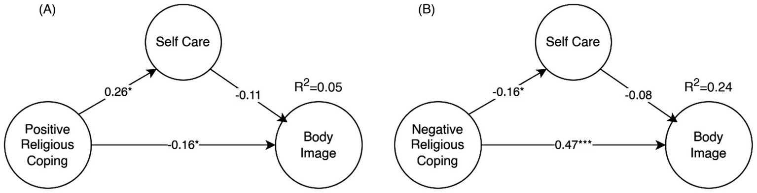 Positive religious coping direct effect on body image concerns and mediation through self-care (A) and Negative religious coping direct effect on body image concerns and mediation through self-care (B). Values shown are the standardize structural regression weights (*p < 0.05, **p < 0.01, ***p < 0.001). For clarity factor loadings and first order factors are omitted.
