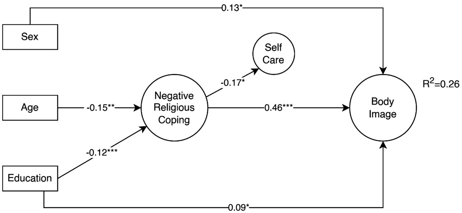 Effects of sex, age and education on the negative religious coping effects on body image concerns and mediation through self-care. For simplicity only statistically significant paths (p ≤ 0.05) are shown.
