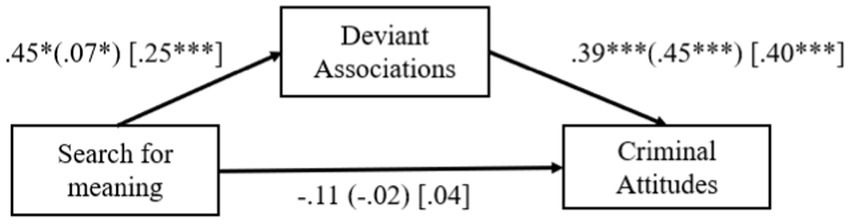 Figure 1. Unstandardized beta coefficients for the relationship between search for meaning, deviant associations, and criminal attitudes (Studies 1A-1B, 2). *p < 0.05, ***p < 0.001. Estimates for Studies 1A and 1B are presented outside and inside parentheses, respectively, while estimates for Study 2 are enclosed in brackets.