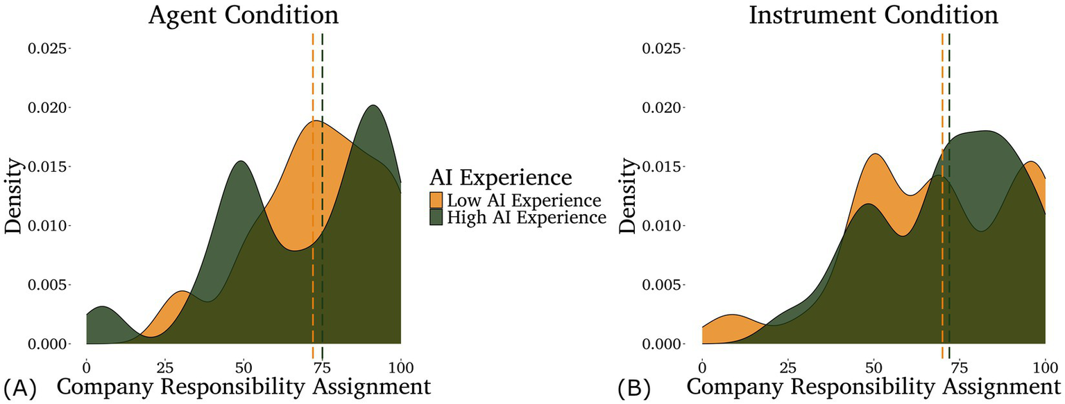 Density plots of the responsibility assigned to the company in the agent (A) and instrument (B) conditions by participants with different levels of self-rated AI experience—low in light/gold (below the mean, n = 80) and high in dark/green (above the mean, n = 42). Note that AI experience was analyzed as a continuous variable, although it is displayed as a categorical variable here for the purpose of data visualization. Medians for each group are shown by the dashed lines.