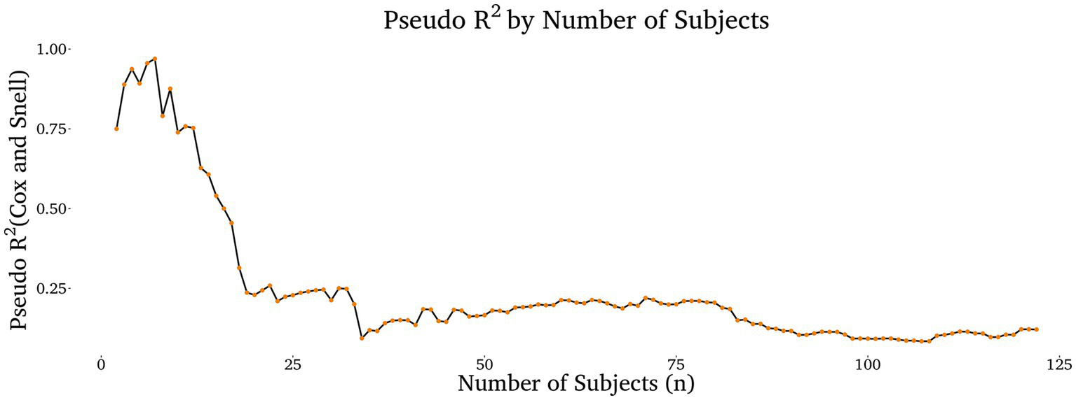 Pseudo R2 measure of effect size (Cox and Snell) by the number of subjects included in the analysis of the responsibility assigned to the AI. The results show that Cox and Snell stabilized at R2 = ~0.12 when data collection was stopped at n = 122.