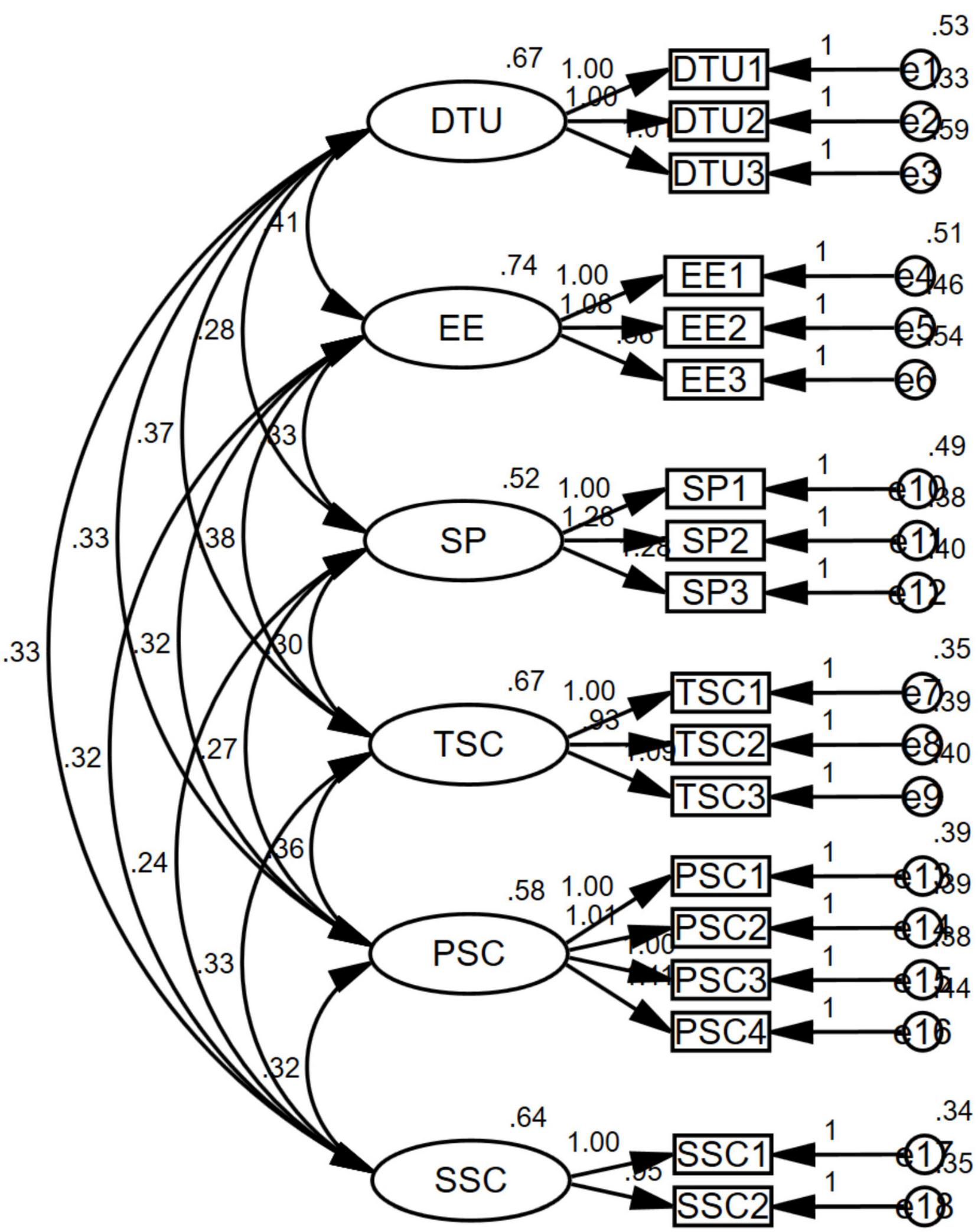 Subsequently, CFA was conducted to validate the identified dimensions, examining the relationships among the core and latent variables (Hair et al., 1998). The composite reliability (CR) for each dimension was above the threshold of 0.7, and the average variance extracted (AVE) for each dimension surpassed 0.5, substantiating the measurement model’s convergent validity (details presented in Table 2).