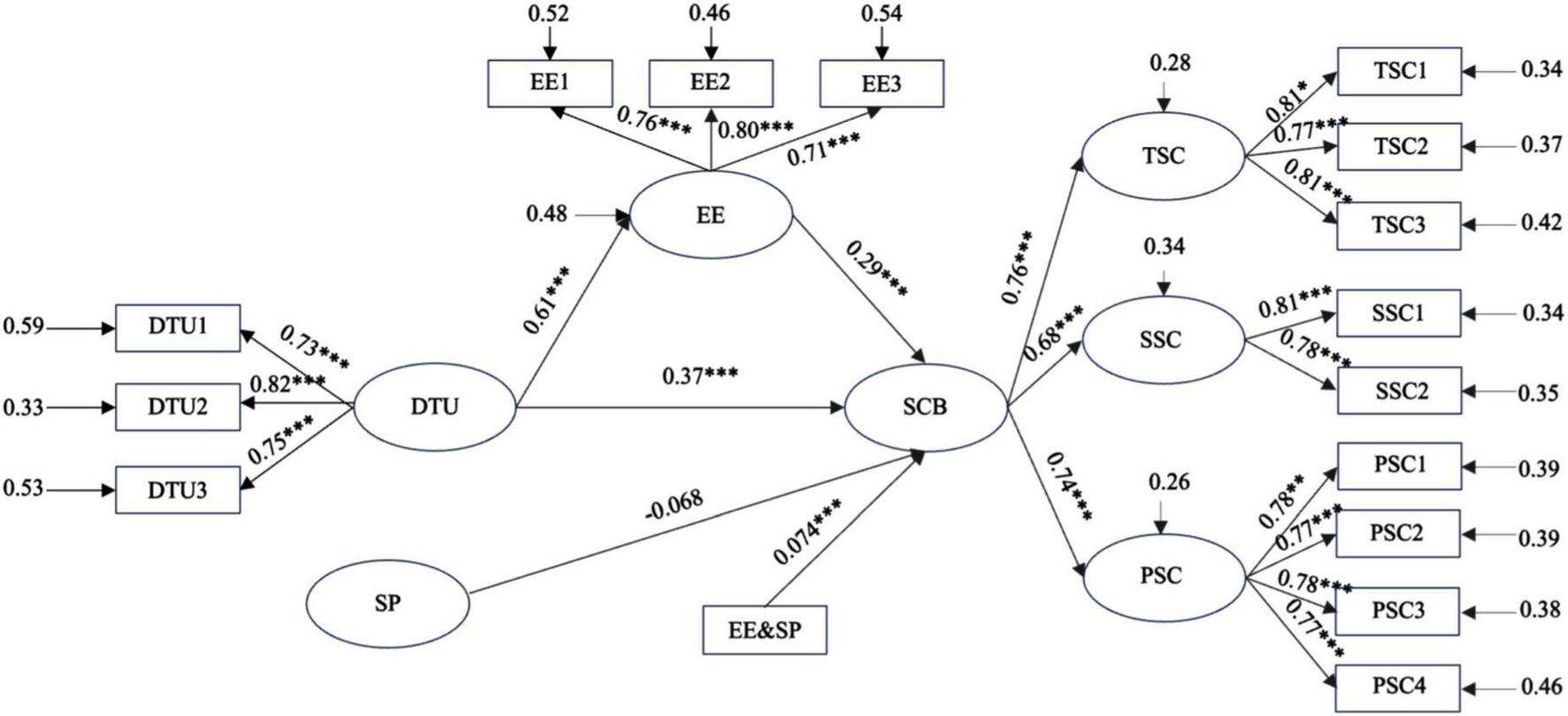 The variable Emotional Experience (EE). This variable refers to the college students’ own emotional states resulting from digital technology use, was measured with three items informed by the research of Happ et al. (2021) and Yu et al. (2023), and tailored to this study’s objectives. Items include EE1: “Engaging in digital sports consumption puts me in a good mood;” EE 2: “Engaging in digital sports consumption makes me feel very satisfied;” EE3: “Engaging in digital sports consumption makes me feel very excited and thrilled.” These items are rated on a 5-point scale, where higher scores indicate more positive bond about emotional experience. In our study, the emotional experience scale exhibited strong internal consistency, as evidenced by a Cronbach’s α value of 0.805.
