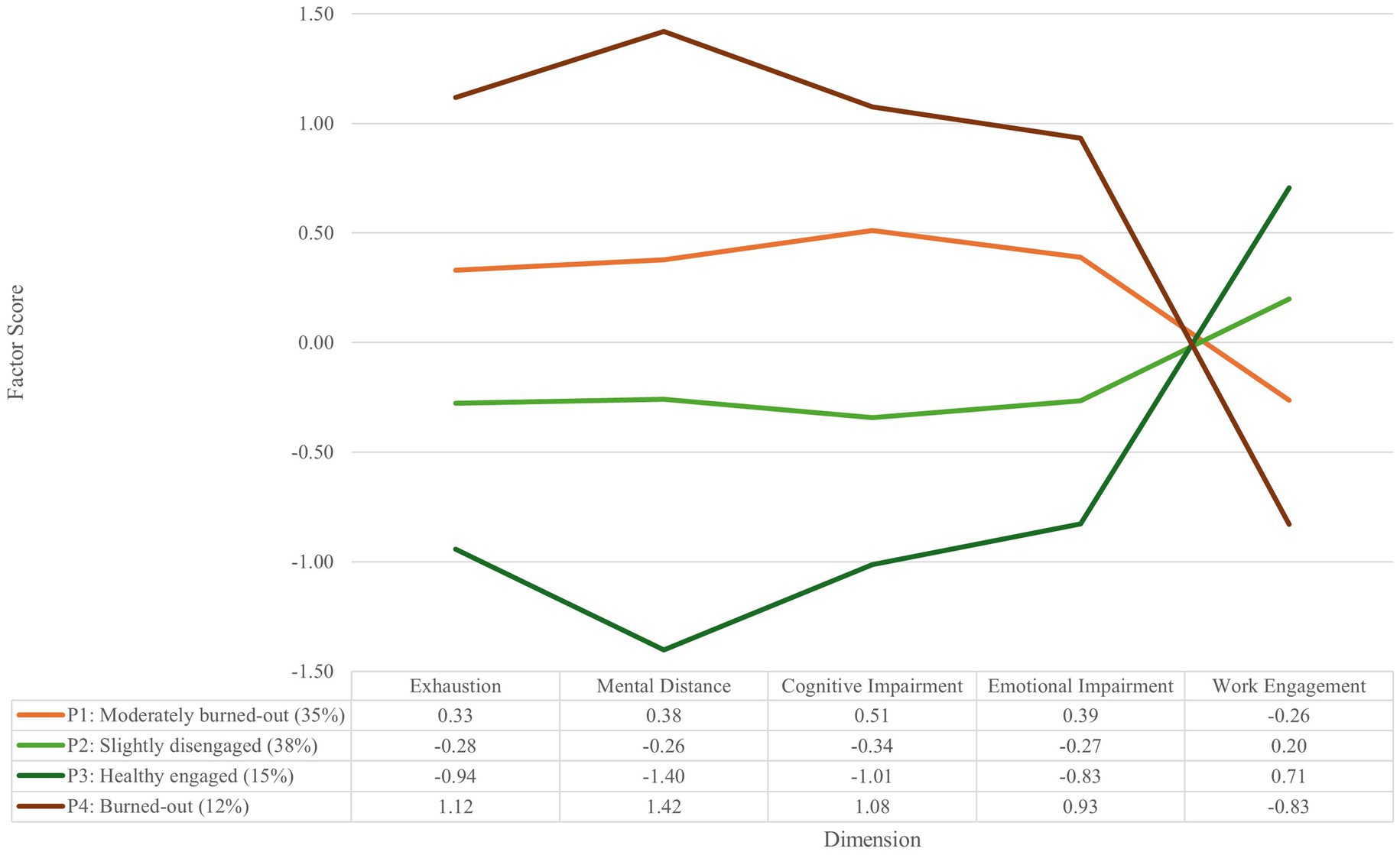 Drawing from previous research that identified latent burnout and engagement profiles among different populations (e.g., Bekker et al., 2024; Boone et al., 2022; Leiter and Maslach, 2016; Luna et al., 2023; Räihä et al., 2024; Salmela-Aro et al., 2019), it was anticipated that emergency nurses would form distinct burnout and engagement profiles based on their scores across the four burnout dimensions and their levels of work engagement. Accordingly, Hypothesis 4 (H4) stated that emergency nurses can be grouped into distinct subpopulations (or latent profiles) characterized by different combinations of burnout symptoms and work engagement levels.
