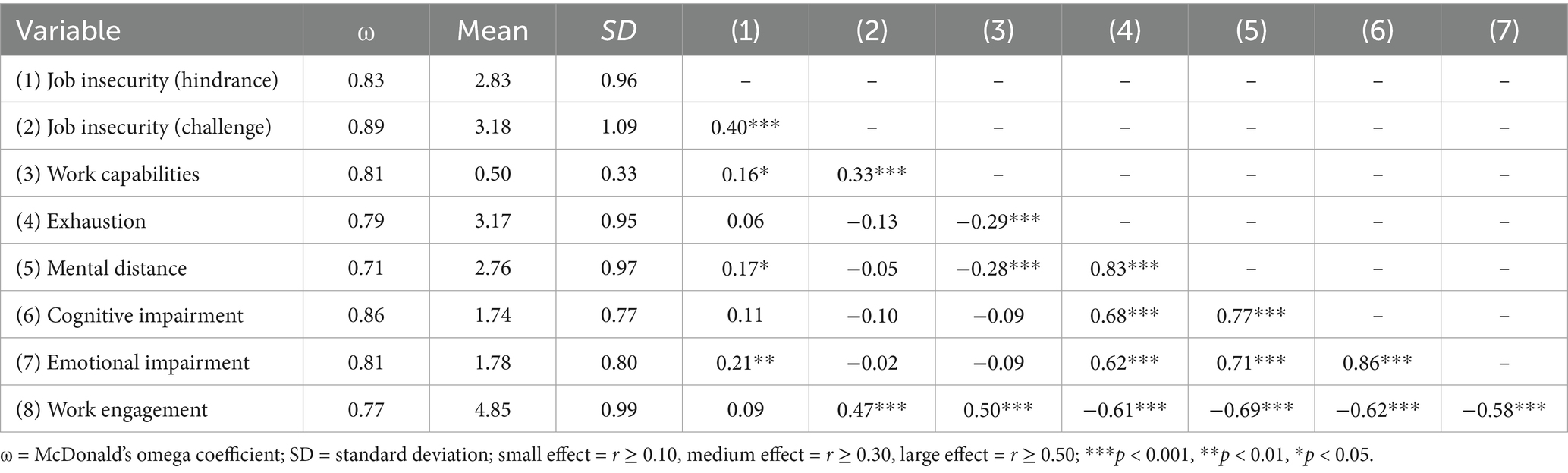 McDonald’s omega coefficient (ω) was employed to investigate scale reliability, using a 0.70 cut-off value. Spearman correlations were used to assess the associations among emergency nurses’ job insecurity appraisal (hindrance and challenge), work capabilities (enabled and achieved work values), burnout (exhaustion, mental distance, and cognitive and emotional impairment), and work engagement. Point biserial correlations were utilized to compute the relationships with work capabilities.