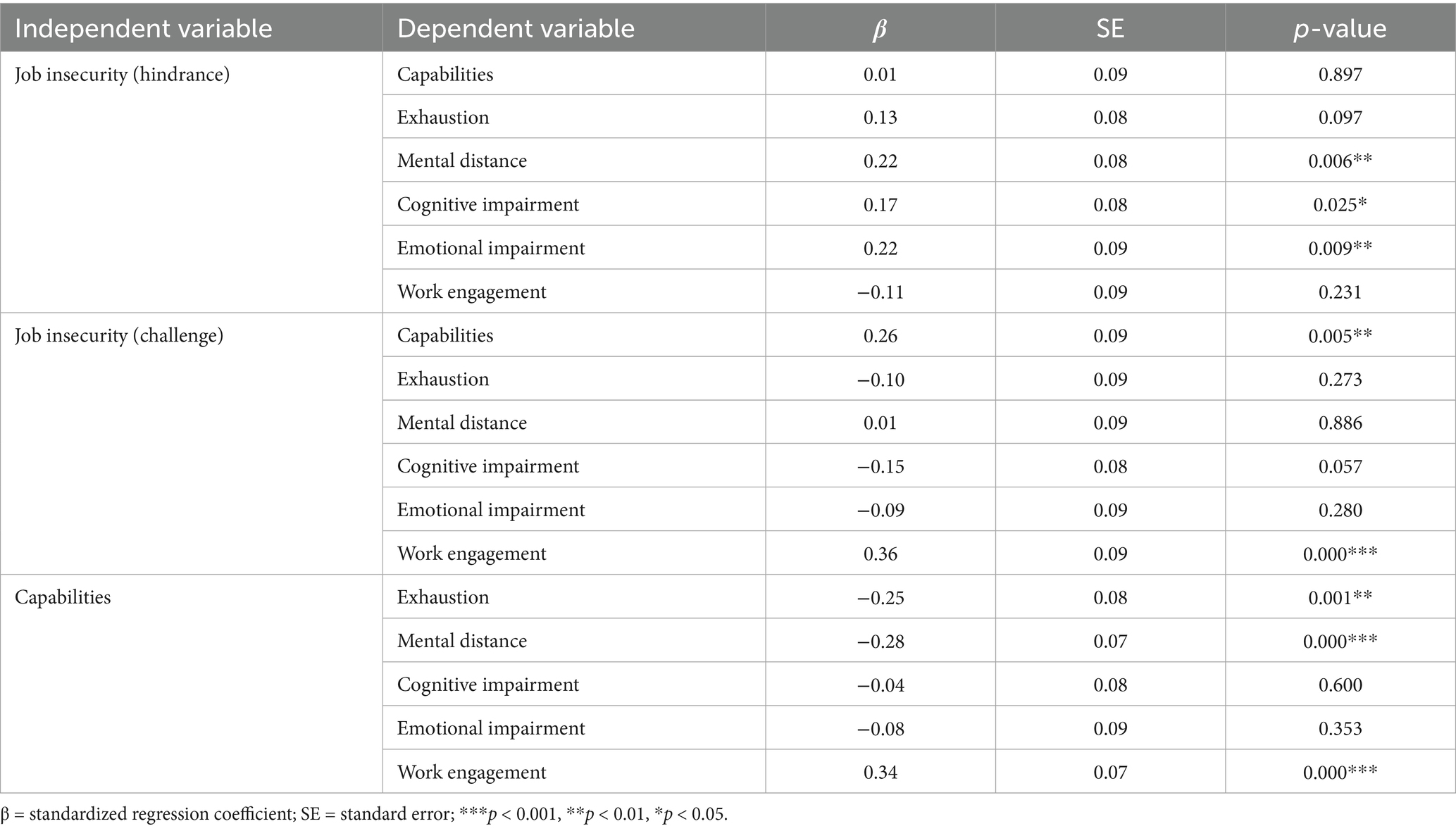 The modern world of work is increasingly characterized by precariousness, with job insecurity becoming a persistent and growing concern (Blustein and Flores, 2023). Emergency nurses are among the most affected, facing complex and demanding roles that expose them to traumatic incidents, heavy workloads, irregular shifts, and emotionally charged encounters with patients and their families. These challenging working conditions place emergency nurses at significant risk of burnout, a state that not only threatens their personal well-being (e.g., depression) but also undermines organizational stability through increased turnover intentions and diminished productivity, ultimately straining the broader healthcare system (De Beer et al., 2022). Given the essential role emergency nurses play in delivering urgent, life-saving care, it is crucial to identify mechanisms that can buffer against burnout and enhance work engagement. Drawing on the Sustainable Employability (SE) model (Van der Klink et al., 2016), this study examines how capabilities (valued work outcomes that are enabled by the work environment and achieved by the individual) affect emergency nurses’ burnout and engagement, and how their job insecurity appraisal (as either a challenge or a hindrance) shape these outcomes.