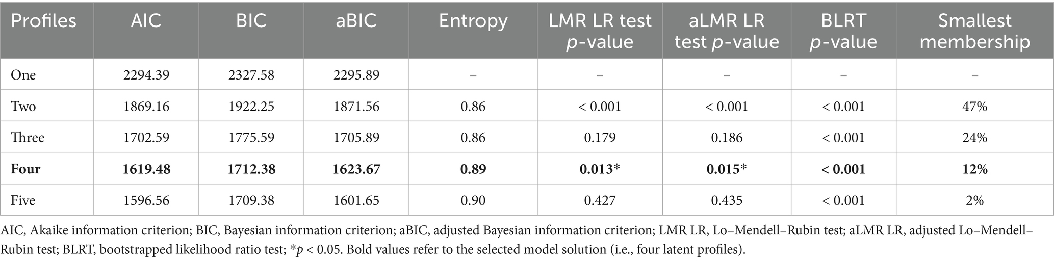 Latent profile analysis (LPA) was used to identify potential latent emergency nurse burnout and engagement profiles. A model was retained if it significantly improved from the reference model to the model with more specified profiles (or subpopulations). The following criteria were employed to assess and compare the models: Bayesian information criterion (BIC), Akaike information criterion (AIC), and sample-size adjusted Bayesian information criterion (aBIC) values (Kline, 2016; Wang and Wang, 2020). To select the model with the optimal number of profiles, the Lo–Mendell–Rubin test (LMR LR; Lo et al., 2001), the adjusted Lo–Mendell–Rubin test (aLMR), and the bootstrapped likelihood ratio test (BLRT; Wang and Wang, 2020) were used. Entropy values were utilized to assess profile verification. A value close to 1 is indicative of acceptable classification. Average latent profile probabilities were computed to determine the probability of correct profile membership, with a cut-off value above 0.80 being a good indicator (Geiser, 2013).