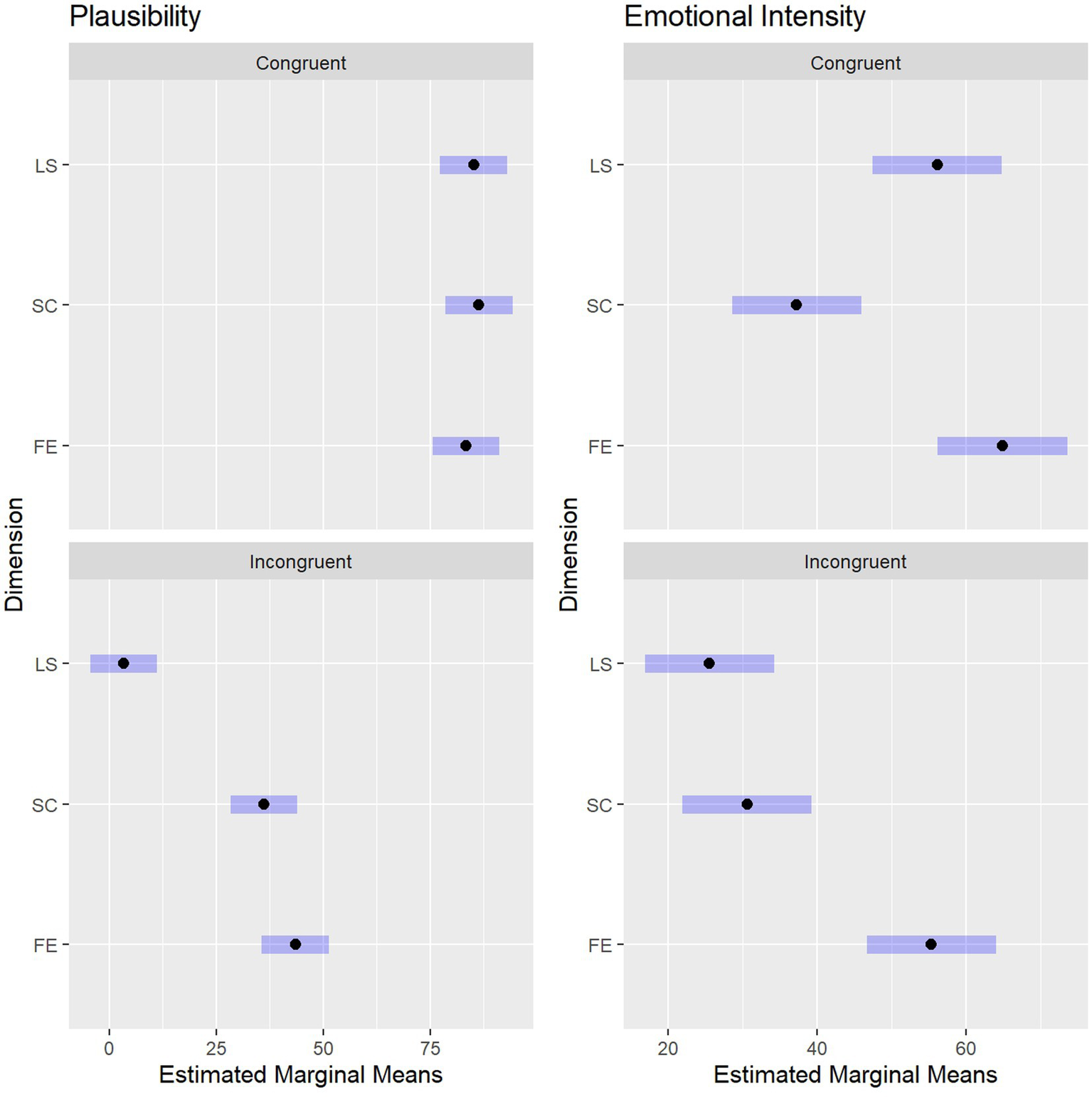 Linear mixed-effects models revealed significant main effects of dimension [χ2(2) = 35.32, p < 0.001, η2p = 0.42 (95% CI: 0.24, 1.00)] and congruence [χ2(1) = 395.05, p < 0.001, η2p = 0.89 (95% CI: 0.84, 1.00)], and a significant interaction between these factors [χ2(2) = 38.22, p < 0.001, η2p = 0.44 (95% CI: 0.26, 1.00)]. Post-hoc analyses showed that none of the dimension contrasts are significant in the case of congruence between cues. In the case of incongruence, however, the comparisons between LS with FEs and with SCs are highly significant in both cases, with estimated differences of 40.14 (p < 0.001*) and 32.82 (p < 0.001*). In contrast, the estimated marginal means (EMM) difference between FEs and SIs (7.32) was not significant (p = 0.361). EMMs for all models are plotted in Figure 1.
