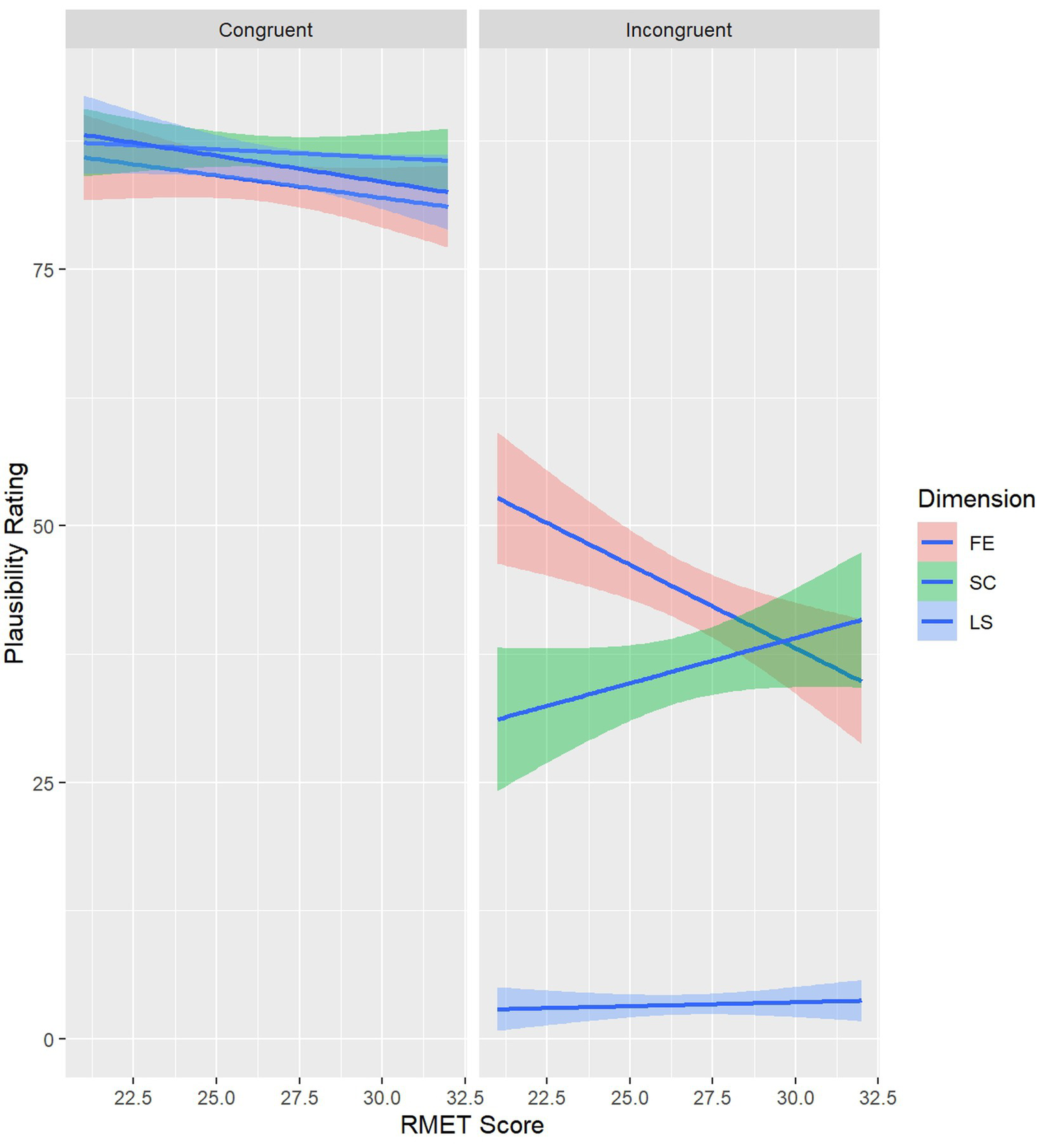For exploratory purposes, Pearson correlations were calculated for plausibility and intensity ratings in each condition with individual RMET scores. In the present sample, the RMET was normally distributed (W = 0.99, p = 0.48) and showed acceptable internal consistency (Cronbach’s α = 0.71).