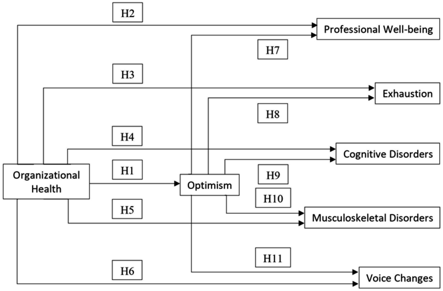 Relatively to H1, H2, H3, H5, and H6, which refer to the research hypotheses that tested direct relationships, it was possible to observe that: (a) organizational health was positively and significantly associated with optimism (H1), and professional wellbeing (H2); organizational health was negatively and significantly associated with Exhaustion (H3), cognitive disorders (H4), musculoskeletal disorders (H5), and voice changes (H6); (b) Thus, all these relationships were confirmed. The hypotheses concerned with the mediation effects were confirmed, given that optimism mediated the association between organizational health and professional wellbeing (H7), Exhaustion (H8), cognitive disorders (H9), musculoskeletal disorders (H10), and voice changes (H11) (Figure 2).