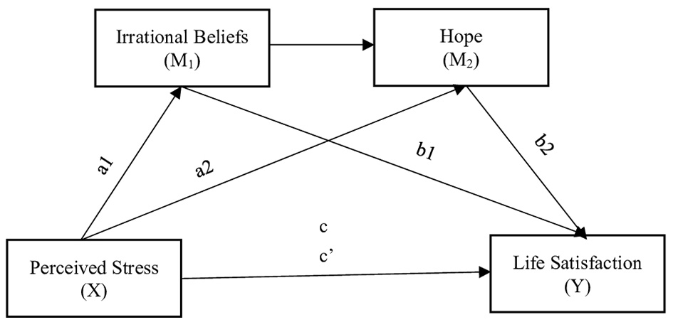 H2: Perceived stress is indirectly associated with life satisfaction through irrational beliefs and hope.