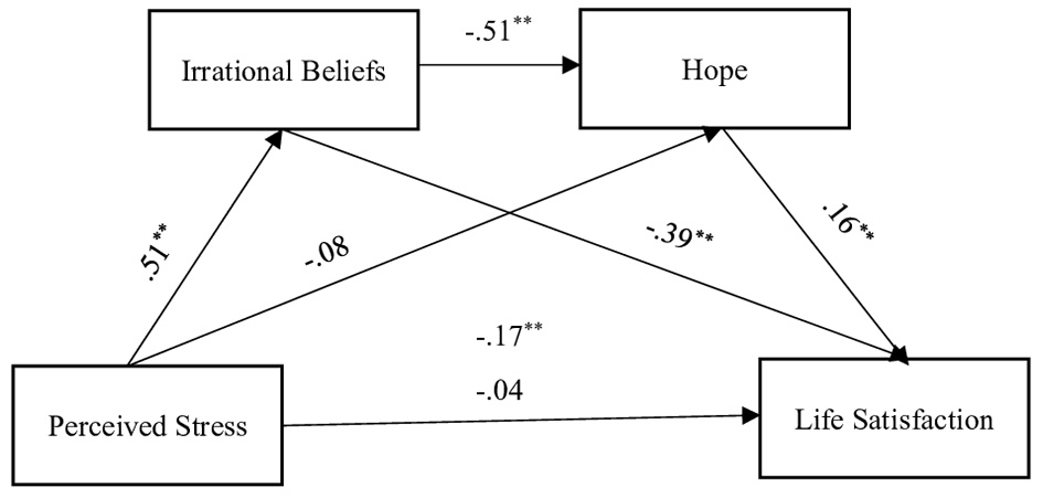 The analyses showed significant correlations among the variables. The results for the model indicated that perceived stress levels were significantly associated with irrational beliefs, hope levels, and levels of satisfaction with life among individuals following the earthquake. In addition, perceived stress levels were indirectly associated with satisfaction with life through their relationships with irrational beliefs and hope.