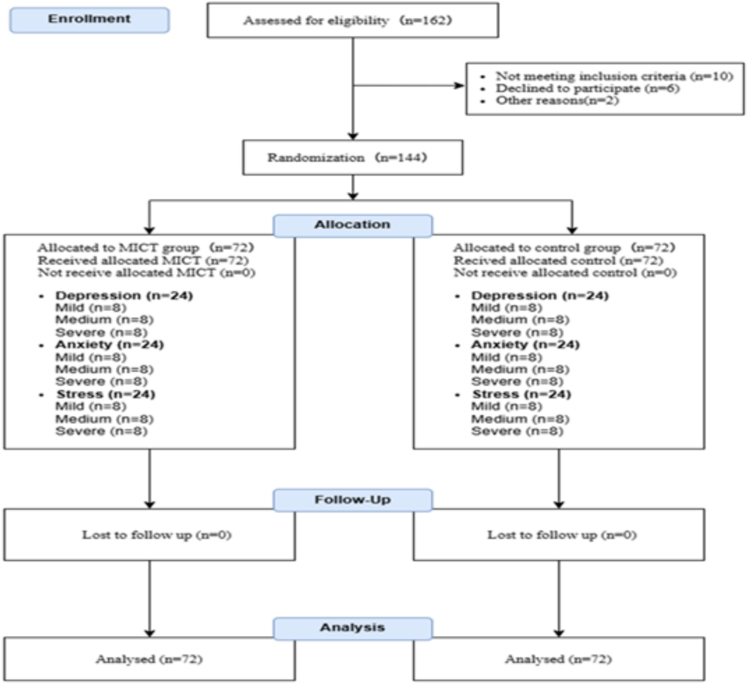 The sample size was selected using the G-Power software and a two-tailed t-test (means). A two-tailed, two-sample t-test was used to assess the difference between two independent means (two groups), with a medium effect size (d = 0.5, α = 0.05, statistical power = 0.8) deemed necessary for statistical significance. This resulted in a total sample size of 128, with 64 participants in each group. Considering the potential for a natural attrition rate during the experiment, 162 participants were initially recruited, with 144 ultimately included in the final experimental analysis, comprising 72 participants in each group. Participants were divided into three categories according to their mood states, with 24 individuals assigned to each of the depression, anxiety, and stress groups. Within each group, three severity levels were considered, with eight individuals each in the mild, moderate, and severe categories.