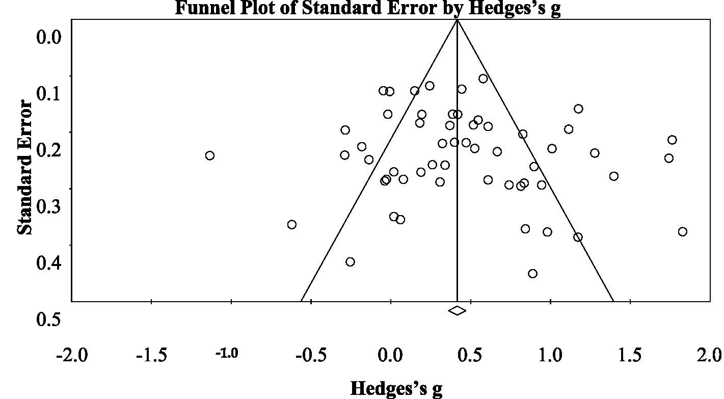Risk of bias in the result of the synthesis due to missing studies or results within studies was considered (Page et al., 2019). To assess small-study effects and bias in the included studies, a funnel plot was generated (refer to Figure 1). Additionally, the classic fail-safe number (Nfs) method (Khoury et al., 2013), Begg and Mazumdar (1994) rank correlation, and Egger et al.’s (1997) regression intercept were utilized. Two independent reviewers, H.B. and Y.A., conducted assessments for each study to identify potential errors in evaluations (Robson et al., 2019). They independently appraised the risk of bias and provided justifications for their judgments. Any inconsistencies in their assessments were resolved through deliborations, ensuring a consensus was reached.