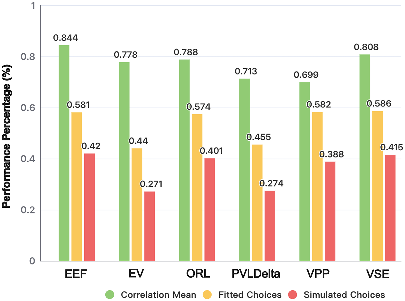 As experimental data and theoretical understanding continue to advance, the validation and comparison of decision-making simulation methods have become increasingly important. This section introduces and compares several decision-making simulation methods used for the IGT. In particular, we introduce two new evaluation metrics—Sequential Exploration Decay (SED) and Forgetting Interval (FI)—which help us further investigate the effectiveness of various methods in capturing forgetting and exploratory behaviors.