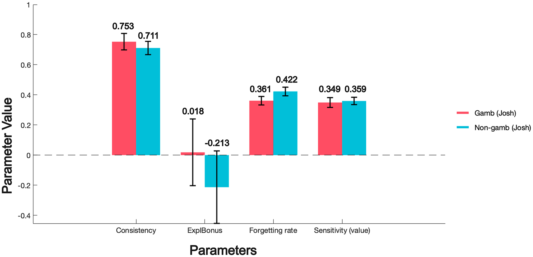 The equation also suggests that in groups with a high level of forgetting, the effect of exploration incentives may be weaker. In high-forgetting groups, individuals are inclined to ignore or quickly forget past information, making them more likely to forget the information related to “how long an option has been unchosen” when making decisions, causing the update of exploration weight to depend more on previous weights rather than on exploration incentives. To consider an extreme case, when the forgetting rate is 1, it implies that an individual with only memory of the current trial completely disregards past information and makes choices based solely on the rewards received in the current trial. In this scenario, the exploration weight remains unchanged from the initial value of zero, and each choice relies exclusively on the utility calculation of the exploitation weight. This distinction illustrates the different ways in which λ impacts exploration and exploitation weights.