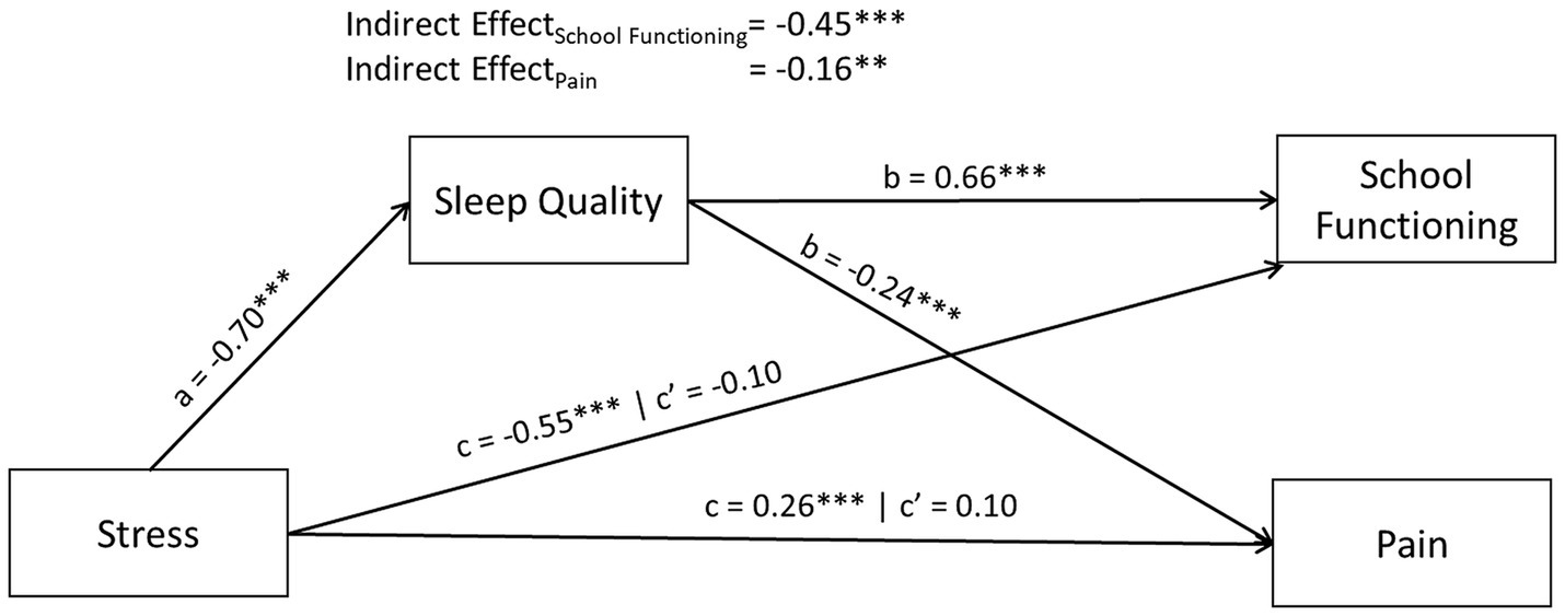 As reported in our correlation results, associations of stress with sleep, pain, and school functioning were significant. However, peer relationships were not significantly associated with stress, therefore it was excluded from further path analysis (Baron and Kenny, 1986). The structural equation model is displayed in Figure 2 and results are reported in Table 3. Stress displayed a significant negative effect on school functioning (r = −0.55, p < 0.001) and pain (r = 0.26, p < 0.001). Sleep quality accounted for 82.0% of the total effect of stress on school functioning and 61.9% of the effect of stress on pain, respectively. For both outcomes, the remaining direct effect of stress was no longer significant once the indirect effect of sleep quality was accounted for (school functioning: β =−0.10, p = 0.15; pain: β = 0.10, p = 0.18).