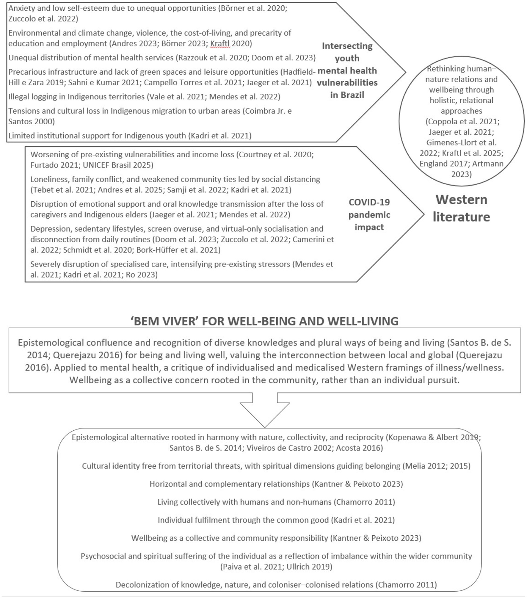 In the following theory section, we discuss youth mental health challenges during and after COVID-19 in more detail before introducing the Indigenous concept and practice of “bem viver” (“good life”) as a decolonial counter-narrative (Kantner and Peixoto, 2023). In the methods section, we outline how we bring together datasets from two research projects to explore the lived experiences and adaptive wellbeing strategies of Brazilian youth in diverse marginalised communities: (1) PANEX- Youth, a participatory research project with young people from two of São Paulo's largest favelas, and (2) survey data gathered with diverse Indigenous communities in the Brazilian Amazon during the COVID-19 pandemic. In the results and discussion section, we (re-)conceptualize the lived experiences and adaptive wellbeing strategies of systematically excluded urban and Indigenous Brazilian youth through the lens of belonging, solidarity, collectivism, and reciprocity. We conclude by making recommendations for wellbeing interventions and policies, grounded in young people's everyday cultural and social realities and diverse knowledges.