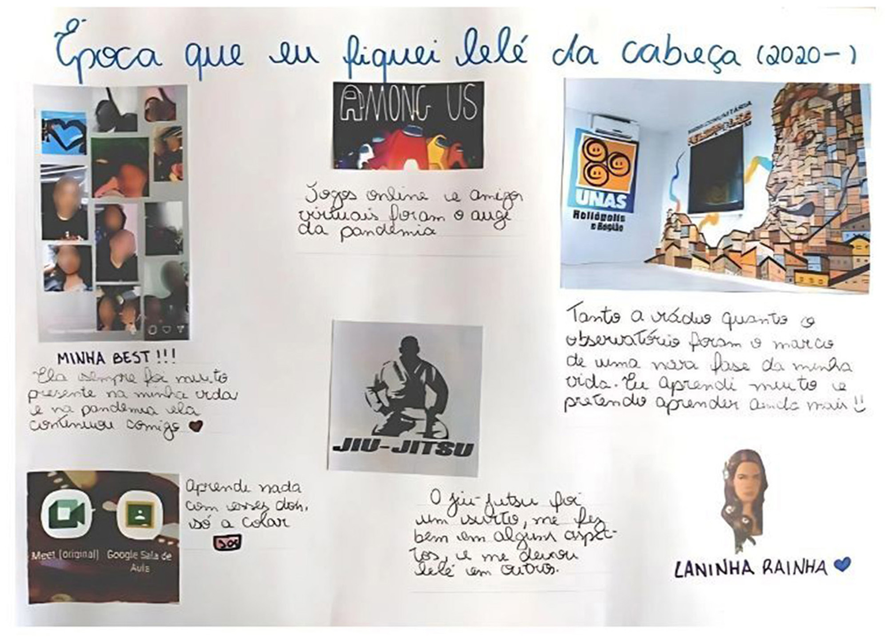 Example of a visual web on youth wellbeing practices developed by a girl from Heliopolis during the COVID-19 pandemic (PANEX Youth project). Caption (translation from originally written in Portuguese): Title “A time when I was out of my mind (2020)”; From left to right – “My bestie! She has always been very present in my life and during the pandemic she has stayed with me”; “Learning nothing but cheating from these two.”, “Online games and virtual friends were the height of the pandemic”; “Jiu-jitsu was an obsession, it was good for me in some ways and it made me crazy in others”; “Both the [community] radio station and the [De olho na Quebrada] Observatory marked a new phase in my life. I've learned a lot and I intend to learn even more”.