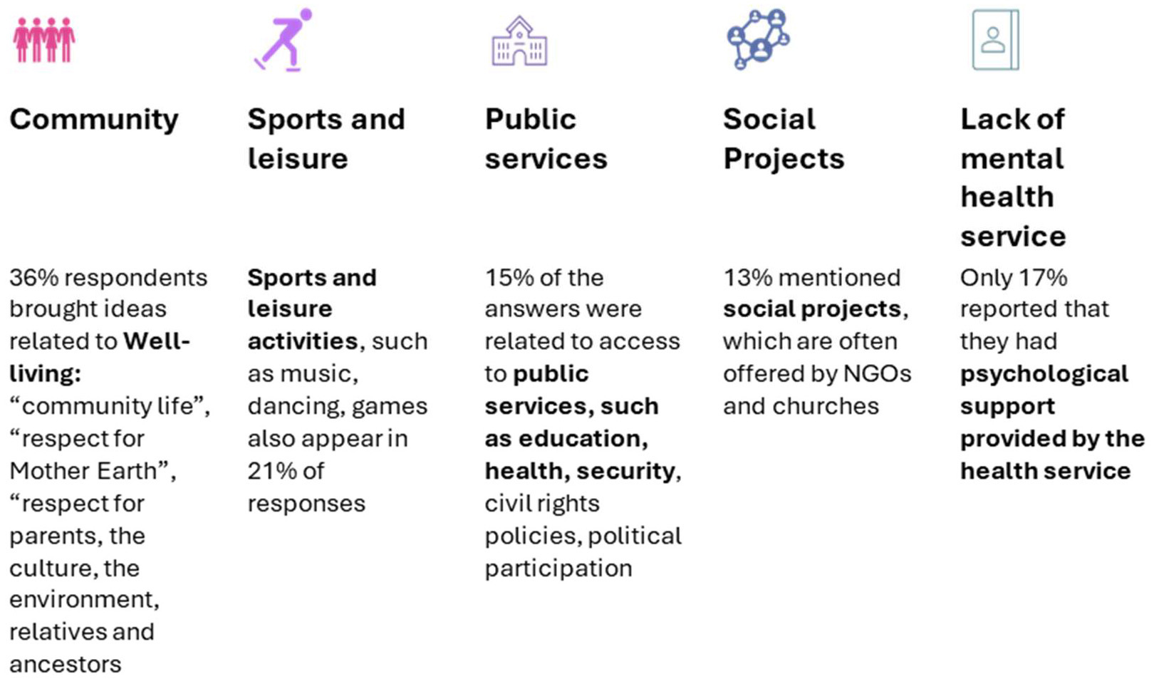 When asked about associations with the term “mental health”, 50% of the young Indigenous people closely related the notion of the “person” and “human being” to the idea of “care”, with a focus on “coexistence” in “community” as important for a broader wellbeing. Indigenous young people overall shared a rather positive notion of “mental health” as a normative concept. In the context of today's world of interconnected crises, there is an urgency to address both the internal (emotional) and external dimensions of the wellbeing and sustainability crisis that young people face for reimagining their futures (Dekeyser, 2022; Wamsler et al., 2021). Among the qualitative responses of Indigenous young people, there were allegations like “It's very important to talk about this, because we need to keep our psychology in balance”, and references to mental health in terms of “normal psychological state”, “things related to emotions” and “psychology and consciousness”.