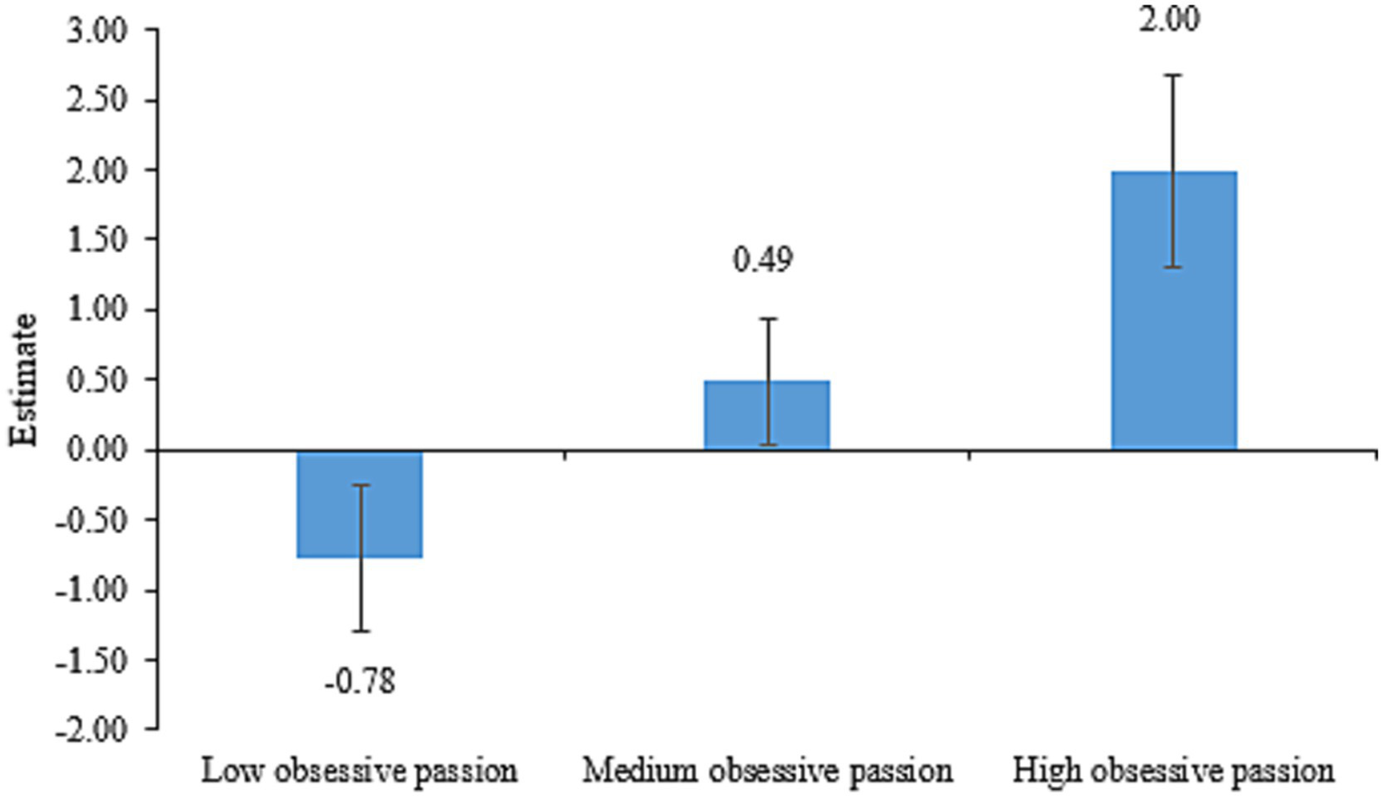 The LPA was performed using items from harmonious and obsessive passions as input. Table 5 presents fit statistics for harmonious passion. As profiles decreased, AIC, BIC, and SSA-BIC all reduced. The entropy index favored the three-profile solution (>0.80). Additionally, aLMR did not reach significance for the four-profile solution, indicating superiority of the three-profile solution as well. Thus, we adopted the three-profile solution. The estimates for three latent profiles of harmonious passion are shown in Figure 1. The first latent profile, which consisted of 142 respondents (20.34%), was characterized by the smallest estimate. We called this profile “low harmonious passion.” The second latent profile, which consisted of 376 respondents (53.87%), was characterized by the moderate estimate. We called this profile “medium harmonious passion.” And the third latent profile, which consisted of 180 respondents (25.79%), was characterized by the greatest estimate. We called this profile “high harmonious passion.”