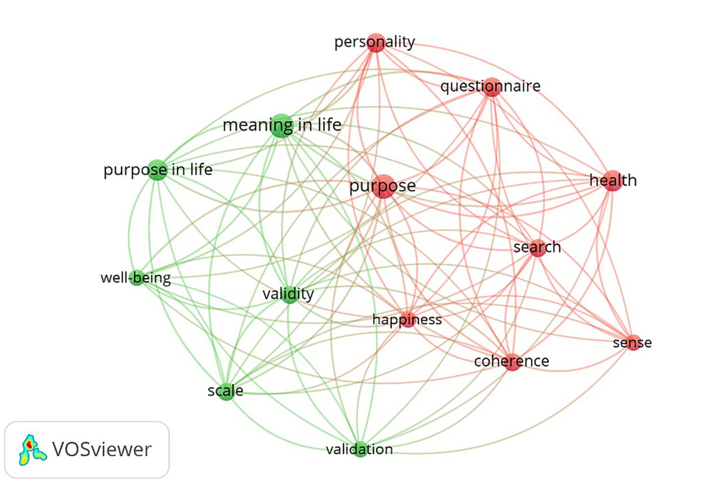 To conduct a comprehensive bibliometric analysis of the selected studies, we utilized VOSviewer software (Van Eck and Waltman, 2009). This analysis was conducted to identify key research trends, influential works, and collaboration patterns, which contribute to understanding gaps in measurement development and the evolution of research on the search for meaning and quest for significance.