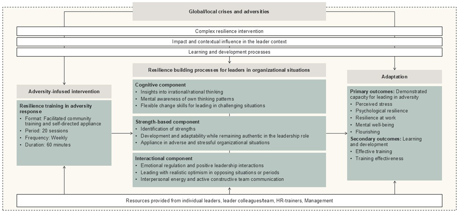 The concept of resilience is necessary for understanding how organizations and leaders respond successfully to crises, unexpected events, and significant adversities. Extreme times, marked by prolonged crises and persistent stressful challenges, underscore its importance. For instance, the COVID-19 pandemic severely disrupted organizational processes and activities, forcing leaders to deliver positive results during prolonged and extraordinary challenges (Țiclău et al., 2021). Since then, crises and unexpected events have increasingly exerted a significant and lasting impact on organizations, necessitating rapid adaptation to ever-changing environments. Recent perspectives on resilience emphasize its multifactorial nature and contextual dependence, which is crucial for understanding how leaders can effectively manage adversity in complex organizational environments (Cooper et al., 2013; Förster and Duchek, 2017; Förster et al., 2022c). Unlike traditional views that consider resilience merely as an individual trait or the ability to “bounce back,” current management research advocates for a broader appreciation of distinct organizational responses to adversity that goes beyond stability as it incorporates thriving and growth from adversity (Munoz et al., 2022). Combined perspectives includes resilience as a dynamic process and outcome involving both individual, situational, and behavioral resilience factors (Förster and Duchek, 2017) unfolded during crises where leaders must anticipate, cope, and adapt (learn) from different demands and challenges to reach high levels of resilience (Förster and Duchek, 2022; Lombardi et al., 2021). Organizations can either enable or hinder resilience through their structural and cultural frameworks, with leadership practices playing a crucial role in shaping these environments. In this perspective, leader resilience is not only positively related to follower performance (Walumbwa et al., 2010), it also creates a culture of well-being and work productivity, significantly enabling or moderating resilience for team members and the organization (Förster and Duchek, 2017). During crises, leader resilience positively affects organizational resilience (Prayag et al., 2024; Țiclău et al., 2021) and employee resilience (Zhang et al., 2024; Singh et al., 2023) serving as social, emotional, and cognitive resources for organizational resilience (Teo et al., 2017). Leaders thus have a great influence in organizations, but importantly, they should also invest in their own resilience (Mann et al., 2021). Psychological leader resilience affects not only their own performance but also sustainability, so those who develop leaders, should create safe environments to help leaders thrive as individuals and as organizational leaders with resilience, which is directly related to the stress of the leader’s job (Ledesma, 2014). Despite this importance of resilience in leader contexts, the research field lacks sufficient knowledge about what makes leaders resilient (Förster and Duchek, 2017; Scheuch et al., 2021; Ledesma, 2014). Some insightful studies have explored leader-enhancing factors in various organizational contexts (Förster and Duchek, 2017; Förster et al., 2022b; Ukhova, 2020; Förster and Duchek, 2022). However, when it comes to learning and building the necessary capacity, meta-reviews uncover a scarcity of empirical evidence on building psychological resilience in leader contexts (Robertson et al., 2015; Vanhove et al., 2016). This has prompted urgent calls for research in managerial resilience training settings and highlighted its necessity due to current adverse circumstances (Scheuch et al., 2021). This training may draw on experience-based learning methods (Förster and Duchek, 2022) and strategic Human Resource Management (HRM) must develop resilience knowledge, skills, and abilities at the individual level that, when aggregated at the organizational level, enable collective intelligence and behavioral preparedness (Lengnick-Hall et al., 2011; Liu et al., 2021). Building on such knowledge, this study concentrates on developing and implementing supportive resilience resources that empower leaders to enhance their adaptive responses, linking psychological and psychosocial resilience with leadership through targeted training in extreme times. The leader-centered resilience intervention embraces what has been stated as one of the paradoxes of human psychology: vulnerability to pressure and adversity is needed for developing the resilience necessary to confront these challenges and achieve high performance (Fletcher and Sarkar, 2016). Here, vulnerability and resilience coexist as leaders must initially yield to adversity derived from their daily work to gain from the psychological and behavioral changes that only organizational context-induced pressure can produce. This intervention approach builds on the concept of “antifragility” (Taleb, 2013) operationalized as a core training principle, suggesting that systems and actors can thrive and grow stronger specifically when they are exposed to stressors. Antifragile systems, such as a leader’s cognitive, emotional, social, and behavioral processes, require exposure to adversity to learn, adapt, and grow, thereby enhancing their ability to successfully navigate future uncertainty. Conversely, avoiding such events can lead to rigidity, weaknesses, and inefficiency, lacking the necessary challenges to prompt a dynamic response (Lukianoff and Haidt, 2018). Today, leaders are constantly exposed to adversity and unexpected events that create significant tensions, requiring them to balance competing demands while capitalizing on opportunities (Förster et al., 2022c; Wu et al., 2021). The intervention in this study trains leaders to navigate various types of adversity by adapting both mindsets and behavior, developing resilience for dealing with tensions and paradoxes (Lewis and Smith, 2023). The interv