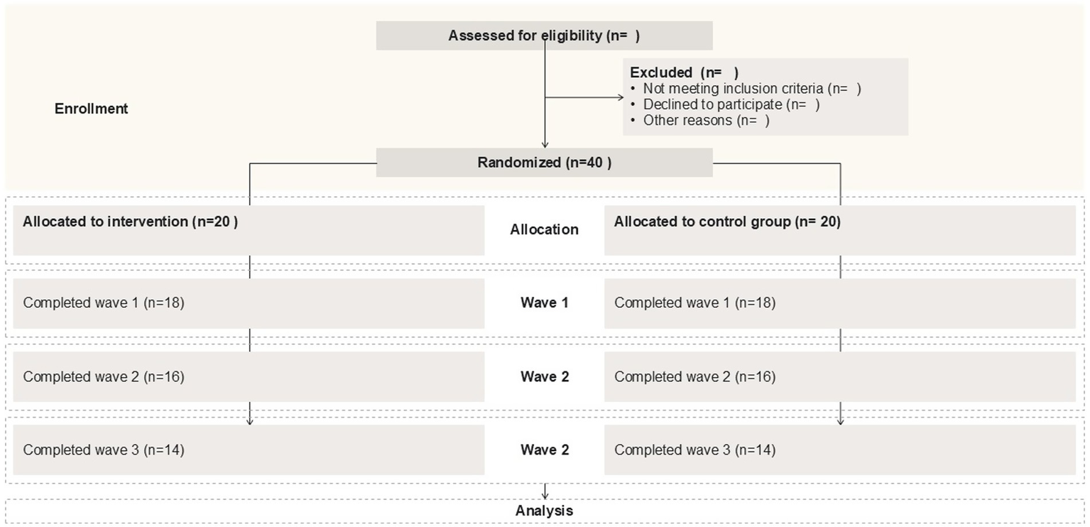 A priori power calculations were conducted using G*Power 3.1 (Faul et al., 2007) to determine the required sample size for a repeated measure and ANOVA assessing the interaction between time (three waves) and group (intervention versus control). The analysis for repeated measures, within-between interaction, was based on the following parameters: a medium Cohen’s effect size (f = 0.25), a significance (Alpha) level of 0.05, desired power of 0.08, and correlation among repeated measures of 0.5 for two groups and three measurements. The power analysis indicated that a total sample size of 28 participants (14 per group) was deemed necessary to achieve 80% power to detect a group x time interaction in this multi-wave organizational trial. Potential attrition across waves is accounted for as indicated in the CONSORT 2010 Flow Diagram in Figure 3, illustrating sample size planning for 30% attrition, assuming attrition occurs evenly from recruitment and across the waves with a rate of approximately 10% throughout the study. However, the aim is to increase the final target sample size to approximately 100 participants to enhance the validity of the study, due to pressures from extreme times in the organizations.