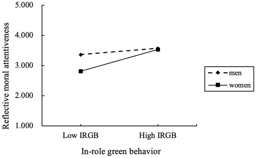 First, research has shown that women are often socialized to be more empathetic and socially responsible. This helps women better understand the moral practices inherent when engage in in-role green behavior (Shahzad et al., 2023), creating a stronger internal motivation to engage in extra behaviors. Moreover, In the theory of virtue ethics, it is suggested that women are more inclined to seek ‘internal goods’ that contribute to the well-being of others rather than focusing on ‘external goods’ related to personal possessions (MacIntyre, 1984; You et al., 2011). This internal-good-based rationality allows women to derive pleasure and satisfaction from behaviors that contribute to society’s well-being. Thus, we propose that women are more sensitive to the effects of reflective moral attentiveness between IRGB and ERGB than men.