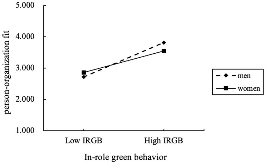 Second, we also propose that the mediating impact of P-O fit is expected to be more pronounced in men than in women. Previous studies have shown that gender plays a role in how employees perceive the workplace, leading to different attitudes toward their organization (Yousaf et al., 2023). However, the potential moderate effect of gender on the relationship between P-O fit and its behavioral antecedents remains uncertain. Interaction psychology suggests that employees’ perceptions of P-O fit may not be determined solely by the attributes of the work environment. Instead, fit perceptions depend on both individual and work environment characteristics. Venkatesh et al. (2017) pointed out that women and men value different work outcomes, leading them to form different fit perceptions. For instance, when male employees engage in in-role green behaviors, they are more motivated to reflect on the organization’s new requirements and values. Since P-O fit evaluates how well an individual’s needs align with what the workplace provides, the perception changes of value fit brought on by IRGB are more critical for man than woman. Hence, we propose that: