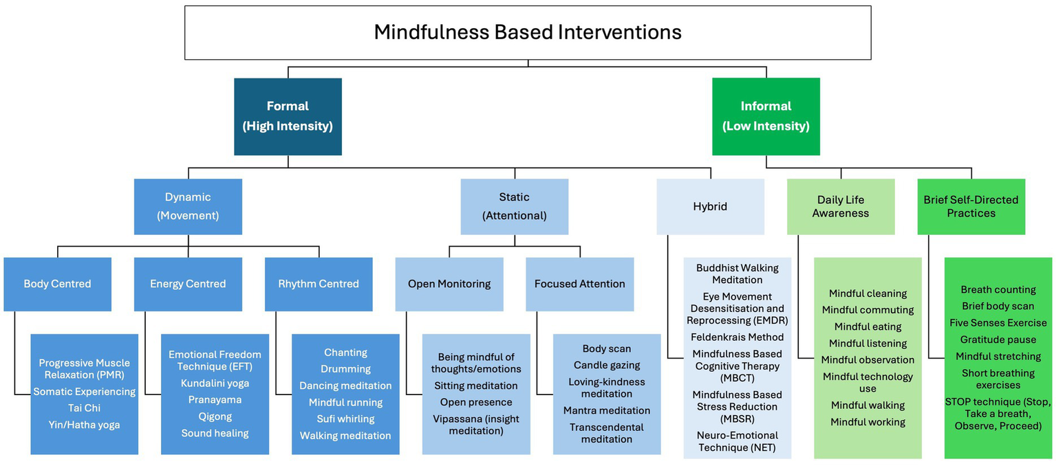 Because chronic stress operates across biological, psychological, and social domains, interventions that target multiple dimensions simultaneously are especially relevant. Mindfulness-based interventions (MBIs) represent one such approach. The following section therefore defines mindfulness and its principal categories before considering how different forms of MBIs apply to MSK practice.