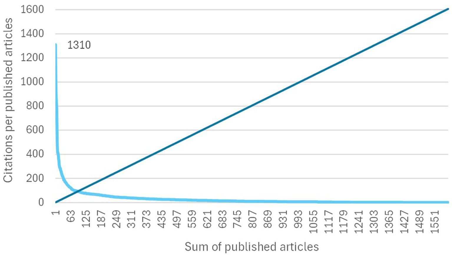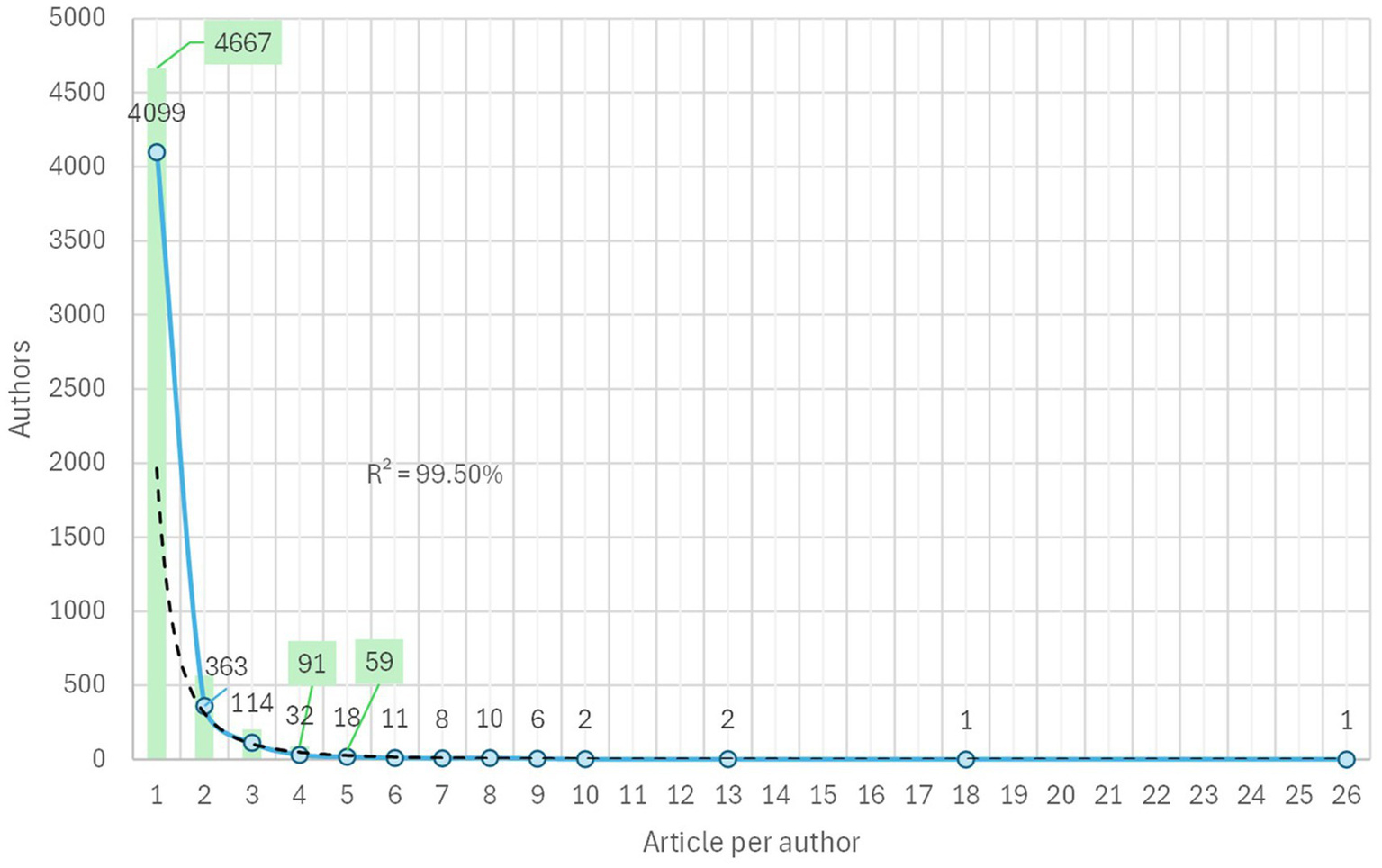 Lotka’s Law allows the segregation of authors of high production in a specific subject from those who have an ephemeral step in a particular area of scientific knowledge (a high percentage of authors who only present one or a relatively small number of published papers). To estimate the concentration of authors, the square root is applied to the total number of authors, which is then adjusted according to a discrete number of publications, and the resulting set of authors are called prolific authors (Lotka, 1926; Nicholls, 1988; Tsai, 2013).