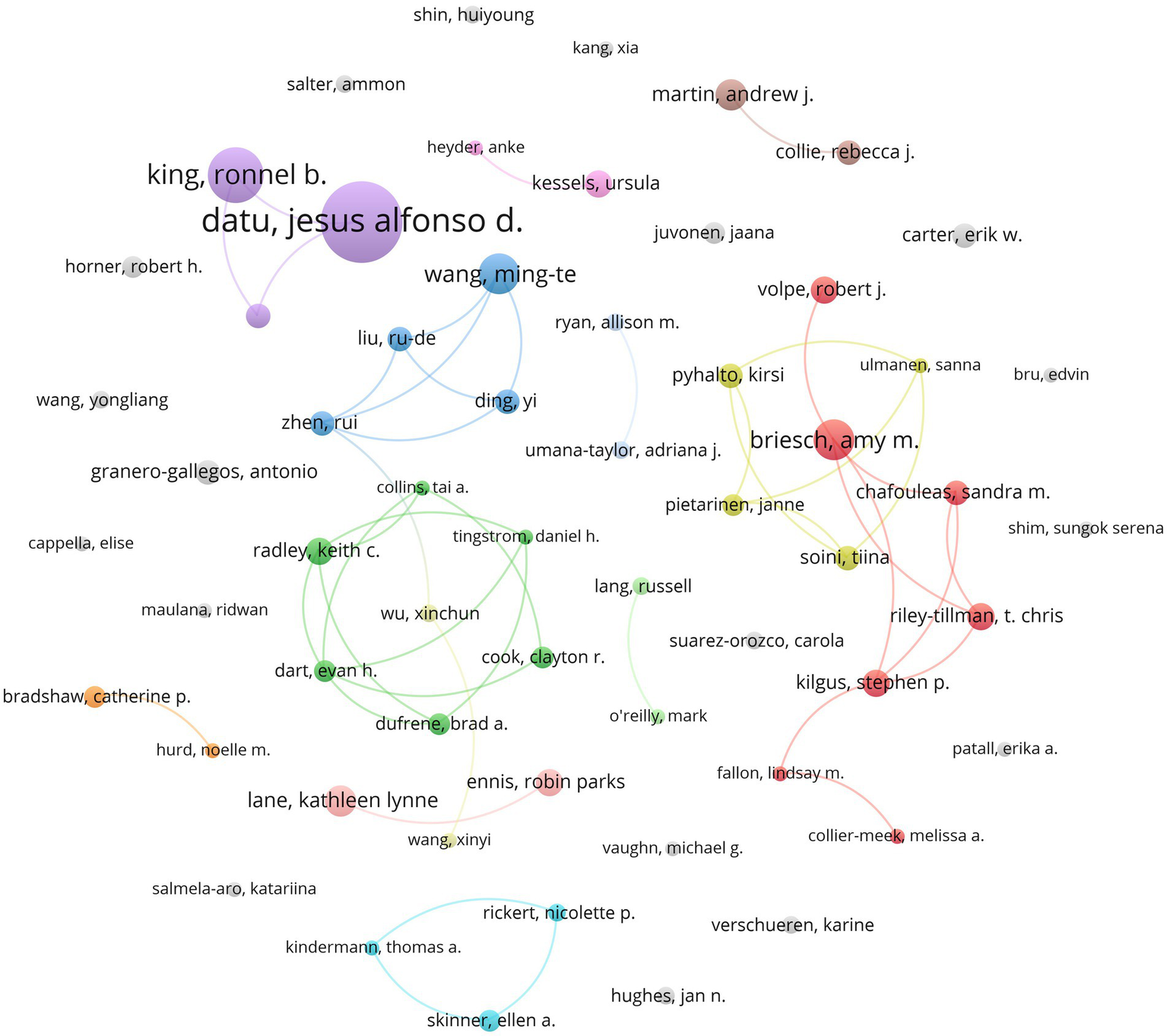 From Figure 2, it can be observed that 91 authors had four or more published articles, and 59 authors had five or more published articles and academic engagement; therefore, prolific authors were estimated at 59, equivalent to inclusion of 303 documents (without duplicates). This small group of authors with a high level of production in the subject (five or more articles) maintained co-authorship relationships, as shown in Figure 3. The most prolific author was Dr. JesĂşs Alfonso D. Datu, an academic from the Faculty of Education, University of Hong Kong, ORCID: https://orcid.org/0000-0002-8790-1113.