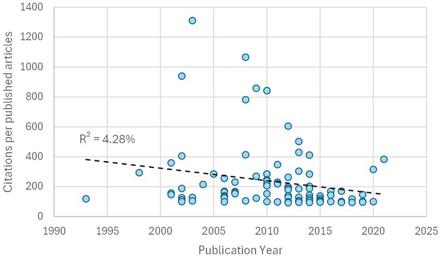 Therefore, in contrast to previous publications (Abramo and D'Angelo, 2022; Pham et al., 2024; Nast et al., 2025), our study aims to provide a worldwide panoramic view of academic engagement research and identify high-impact research on this type of behavior in educational settings. It answers how certain variables are related to high citation counts, depending on the age of the documents, characteristics of their authors, national authorship ascriptions, journals of publication, and open access to these documents. Asking the question, “What are the highest impact mainstream research publications on academic engagement in educational settings?” allows us to identify global research and training benchmarks, providing input to the epistemic community of researchers and educational decision-makers.
