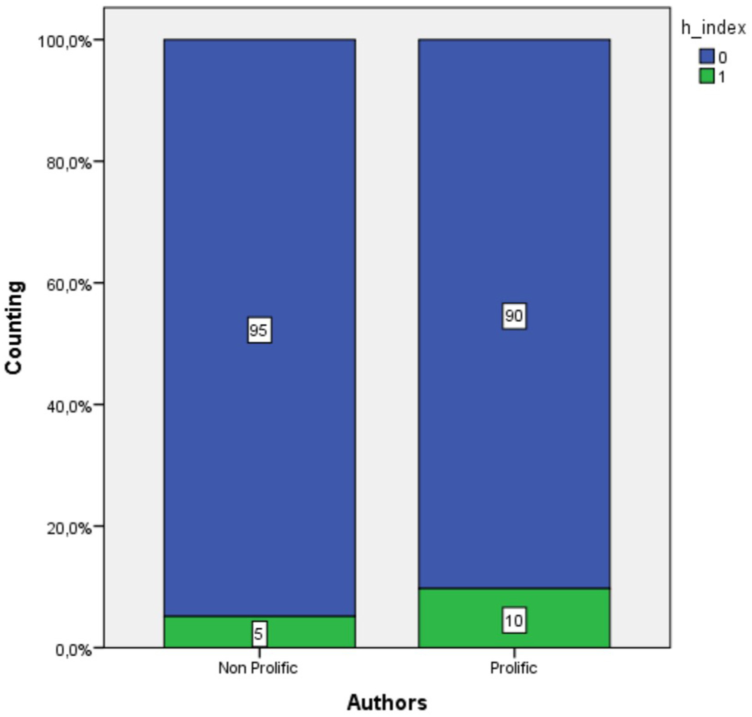 The Hirsch index determines the relative impact of scientific productivity on a corpus of selected articles. It is expressed as the value n of documents, implying that these n documents have obtained n or more citations on a common counting basis for all these (Hirsch, 2005; Crespo and Simoes, 2019). In addition, we studied the relationship between the age of publication and the number of citations and the inclusion of an article in the h-index in relation to: (1) the authorship of one or more prolific authors, (2) the affiliation of one or more authors to a prolific country, (3) publication in a journal specialized in the subject (belonging to the Bradford core), or (4) some form of open access to the article.