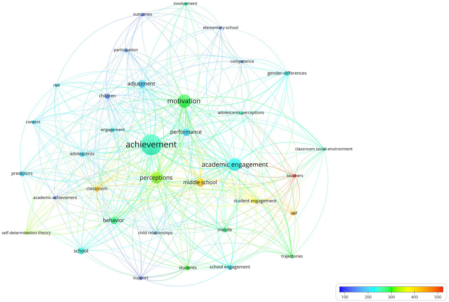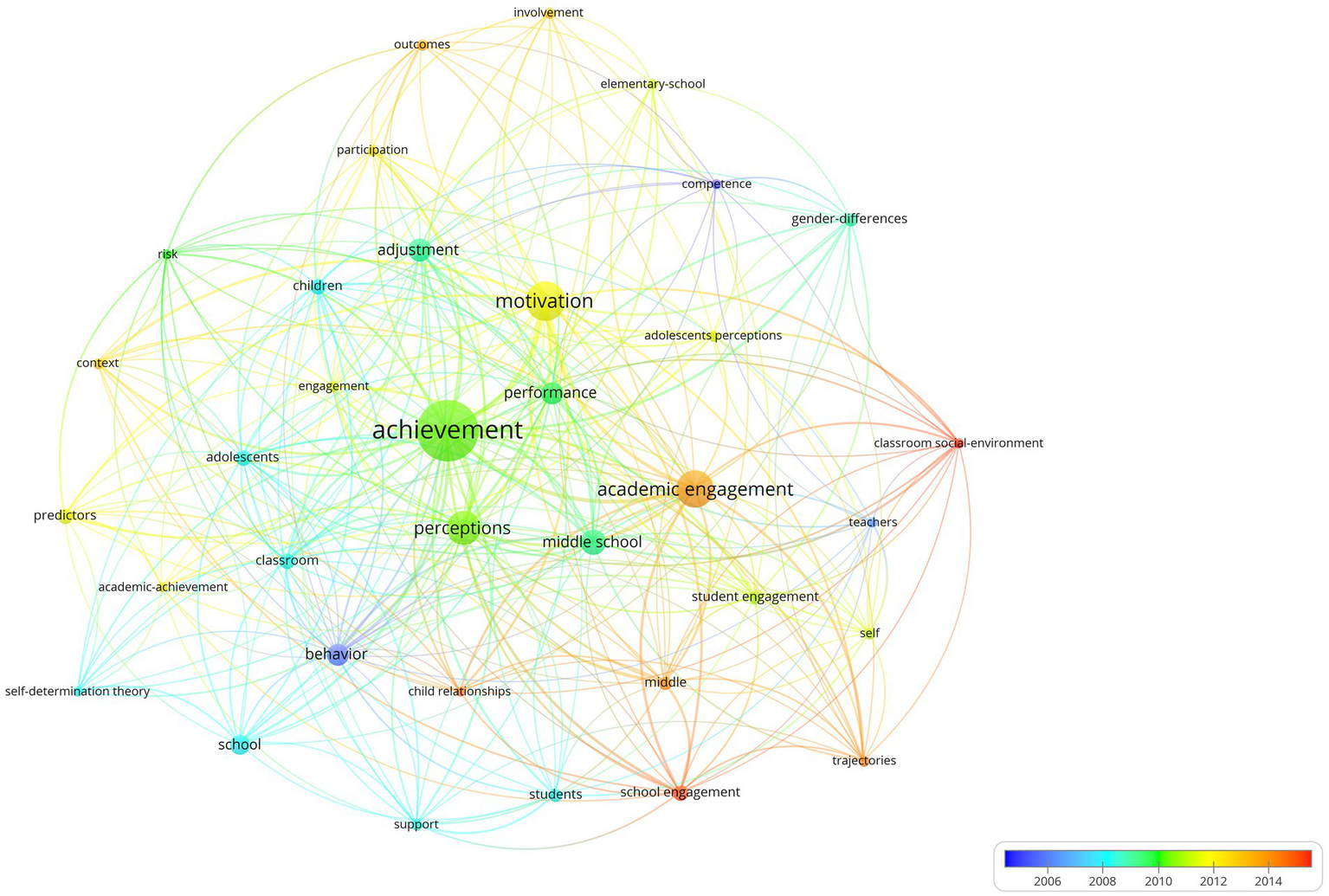 The publication of selected articles grew exponentially year by year, presenting concentration levels of 1% in authorship, 49% in a single country, and 5% in journals, identified as outstanding Keywords plus® central aspects of academic engagement (classroom-social environment and school engagement), in addition, 6% were in highly cited articles.