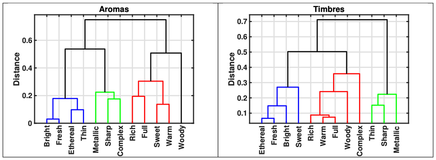 Turning to the specific concepts that emerged from the cluster analysis, the first cluster (in blue) appears to align with attributes of brightness, freshness, and ethereality; the second cluster (in red) centers around descriptors such as fullness, richness, and warmth; and the third cluster groups together qualities like sharpness and metallic character. This structure is reminiscent of the salient semantic dimensions of luminance, texture and mass previously reported for timbral semantics (Zacharakis et al., 2014; Zacharakis and Pastiadis, 2016). Another similarity concerns the term woody, which appears less associated with the other descriptors, particularly in aroma descriptions, but also to a degree in timbre. Although woody loosely aligns with the full/rich cluster, it shows relative independence across both modalities. In contrast, thin alternates between the bright/fresh cluster for aromas and the sharp/metallic cluster for timbres, which, however, is not conceptually unexpected. A similar pattern appears with complex, which tends to be more independent within timbre descriptions (loosely associated with full/rich) but aligns with the sharp/metallic cluster in aroma semantics. Finally, sweet also alternates between the bright/fresh cluster in timbre semantics, and the full/rich cluster in aromas semantics. Future work should examine whether these differences reflect systematic differences in how these descriptive terms are used to convey timbral and aromatic qualities, or whether they are driven by specific characteristics of the present stimulus set.