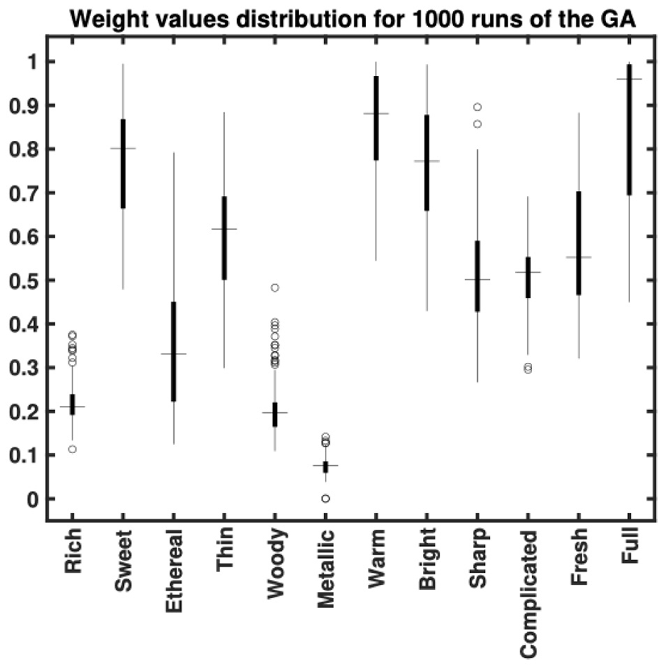 Distribution of weight values assigned for 1,000 runs of the genetic algorithm optimization. This figure indicates that the optimization promotes the importance of some semantic scales (e.g., sweet, warm, bright and full) over others (e.g., rich, ethereal, woody and metallic).
