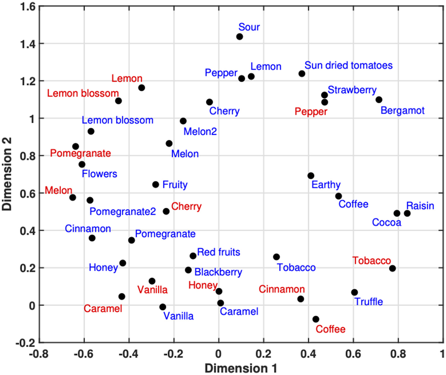 A visual inspection of the spatial configuration reveals a notable organization of scents. Starting at the top right with black pepper and moving clockwise, bitter and spicy odors such as tobacco, coffee, and cinnamon transition into sweeter aromas clustered at the bottom left, including caramel, vanilla, and honey. The configuration then rises toward the middle left with fruity scents like melon, cherry, and pomegranate, before arriving at sour scents at the top left, such as lemon and lemon blossom.