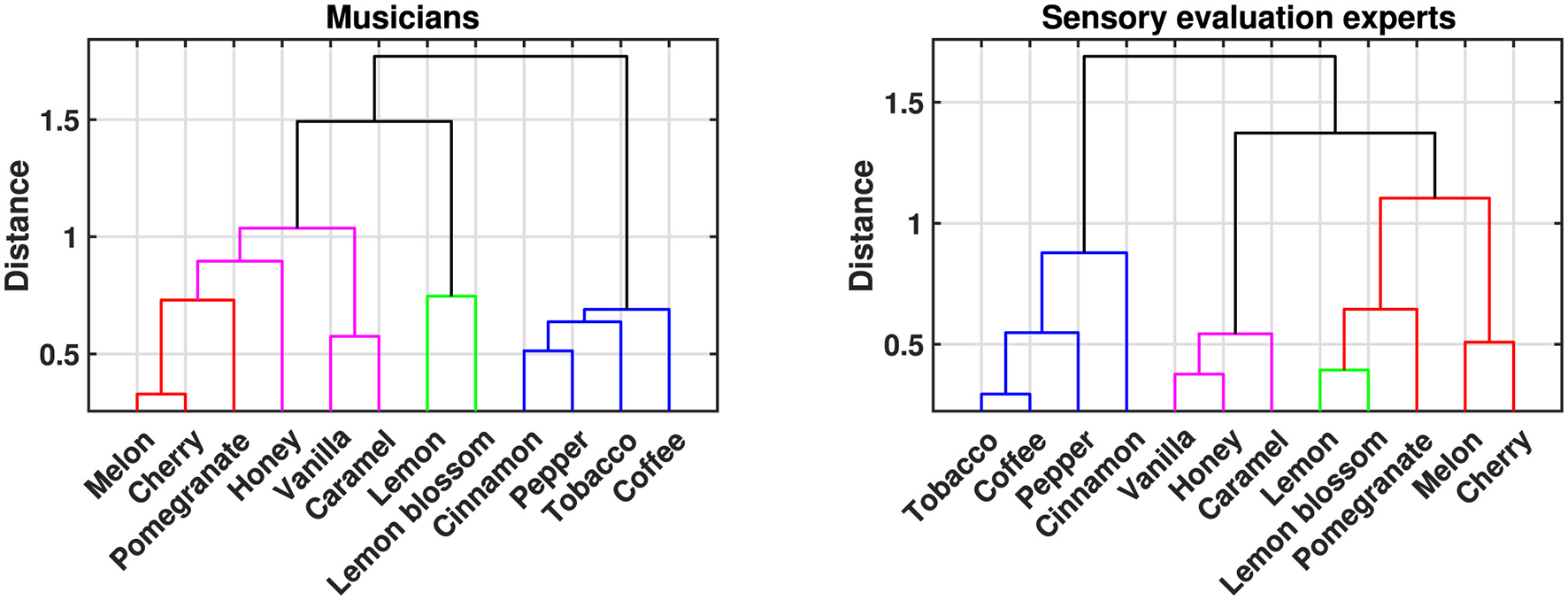 Interestingly, this organization of scents based on semantic differences seems to align well with the organization produced through cluster analysis (complete linkage, distance metric: cosine similarity) of judgments on direct auditory-olfactory associations. Figure 4 shows this organization in the form of dendrograms. The left one refers to the data collected by a panel of 29 musicians presented in Zacharakis (2024), while the one on the right comes from the ratings by a panel of 25 experts in sensory evaluation (e.g., food scientists, sommeliers, winemakers, etc.) on the same stimuli. The dendrograms between the two groups of participants mainly differ in the clustering of fruity scents (i.e., melon, cherry and pomegranate). Musicians group them along with sweeter aromas (i.e., vanilla, caramel and honey) while sensory experts group them with the more sour scents (i.e., lemon and lemon blossom). The cluster comprising spices and other scents is identical in both groups. This level of organization is also reflected in the MDS space derived from optimized differences in semantic description. The fruity, sour and sweet scents occupy the left half of the space (dimension 1) while the four spices/others occupy the right half. Additionally, fruity aromas are located between sour and sweet ones on the vertical axis (dimension 2), which helps explain the discrepancy in their grouping—either with sweet or sour scents—across the two participant groups.