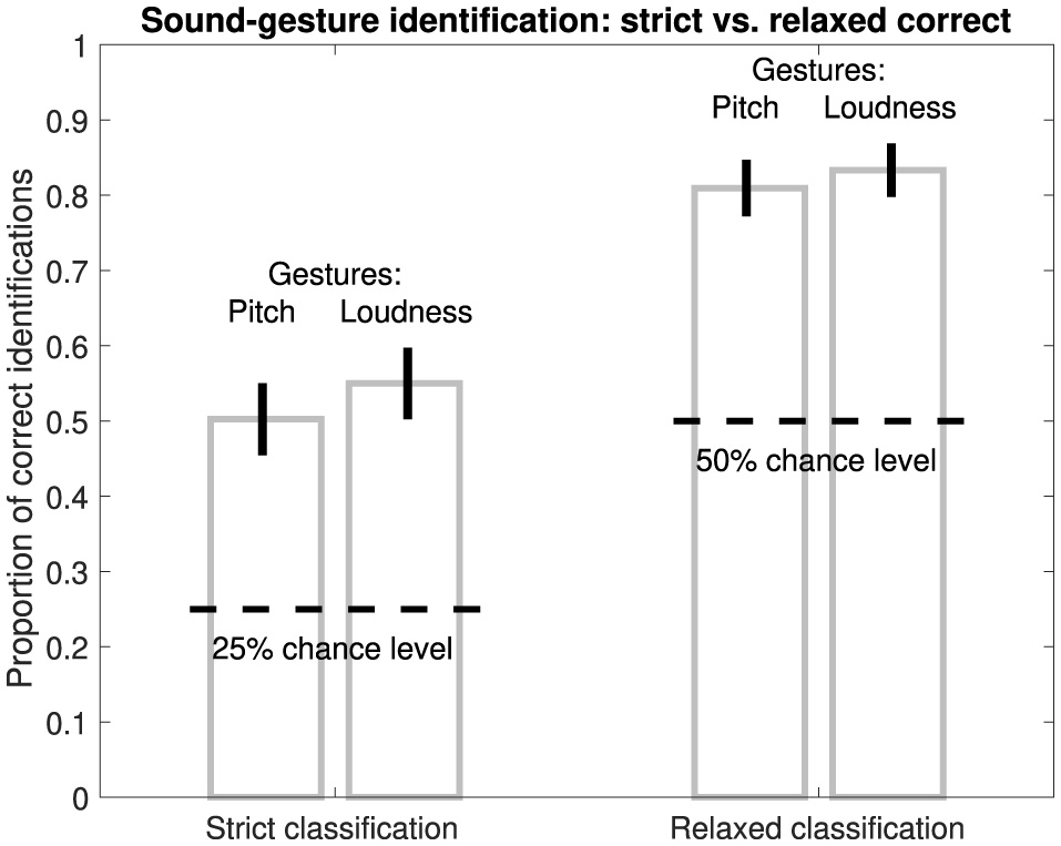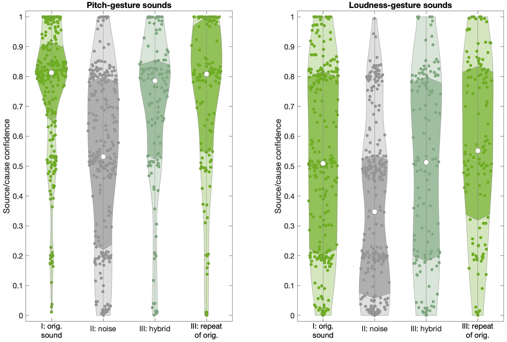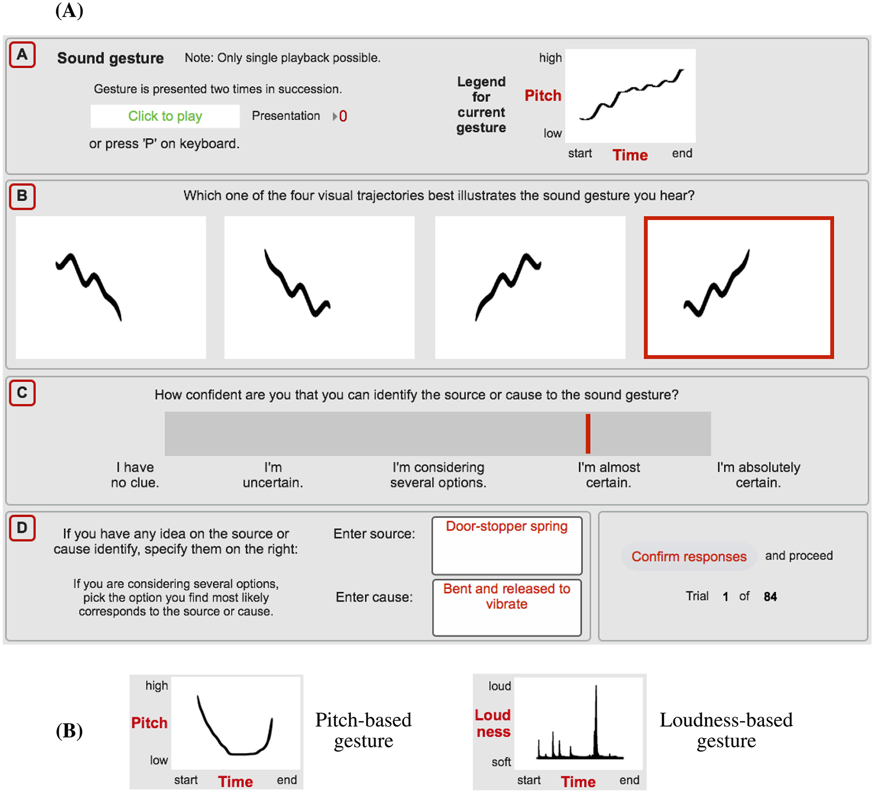 Sound stimuli involved gestures expressed through either pitch or loudness variation, which naturally occurred in a set of environmental sounds. Each sound gesture was presented in three conditions or sound types: (1) the original environmental sound, (2) a noise-based isolated gesture, and (3) a hybrid of the two. Whereas the original sounds exhibited acoustical cues that conveyed both the gesture and the sounds' source or cause, the noise-based sounds were designed to obscure cues for source/cause identification.