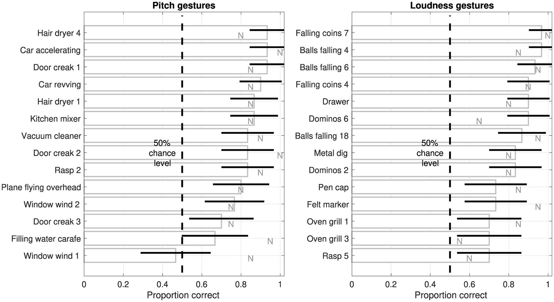 For the main experiment, these two sets were reduced down to 14 sounds for each gestural parameter to limit the experiment's scope and duration. The sub-selection was informed by results from a pilot experiment with five untrained listeners, who were asked to choose the correct gesture out of four options after hearing an isolated, noise-based gesture; this employed the same crossmodal-matching task described in Section 2.3. The 14 sounds for each parameter were sampled across the range of 60–100% of correct identification. Gestures exhibiting identification rates below that range were not included because 1) they were deemed even less likely to be identified when occurring in the original environmental sounds and 2) they were less likely to yield statistical differences from 25% chance level for the anticipated sample size of 20 participants.