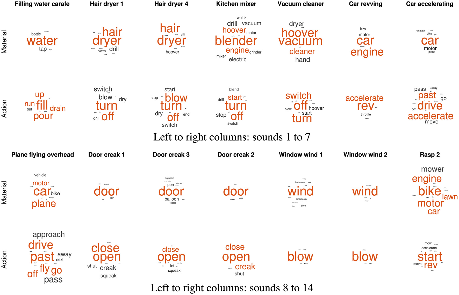 Through listening to environmental sounds, humans can infer what events occur, what underlying sources cause them, how and where events take place, when they occur, and how they evolve over time (see Guastavino, 2018; Giordano et al., 2022, for recent reviews). Among this range of semantic categories and labels, the most prevalent concern the sources or objects (what) and actions (how) that underlie environmental sounds (Guastavino, 2018; Giordano et al., 2022).
