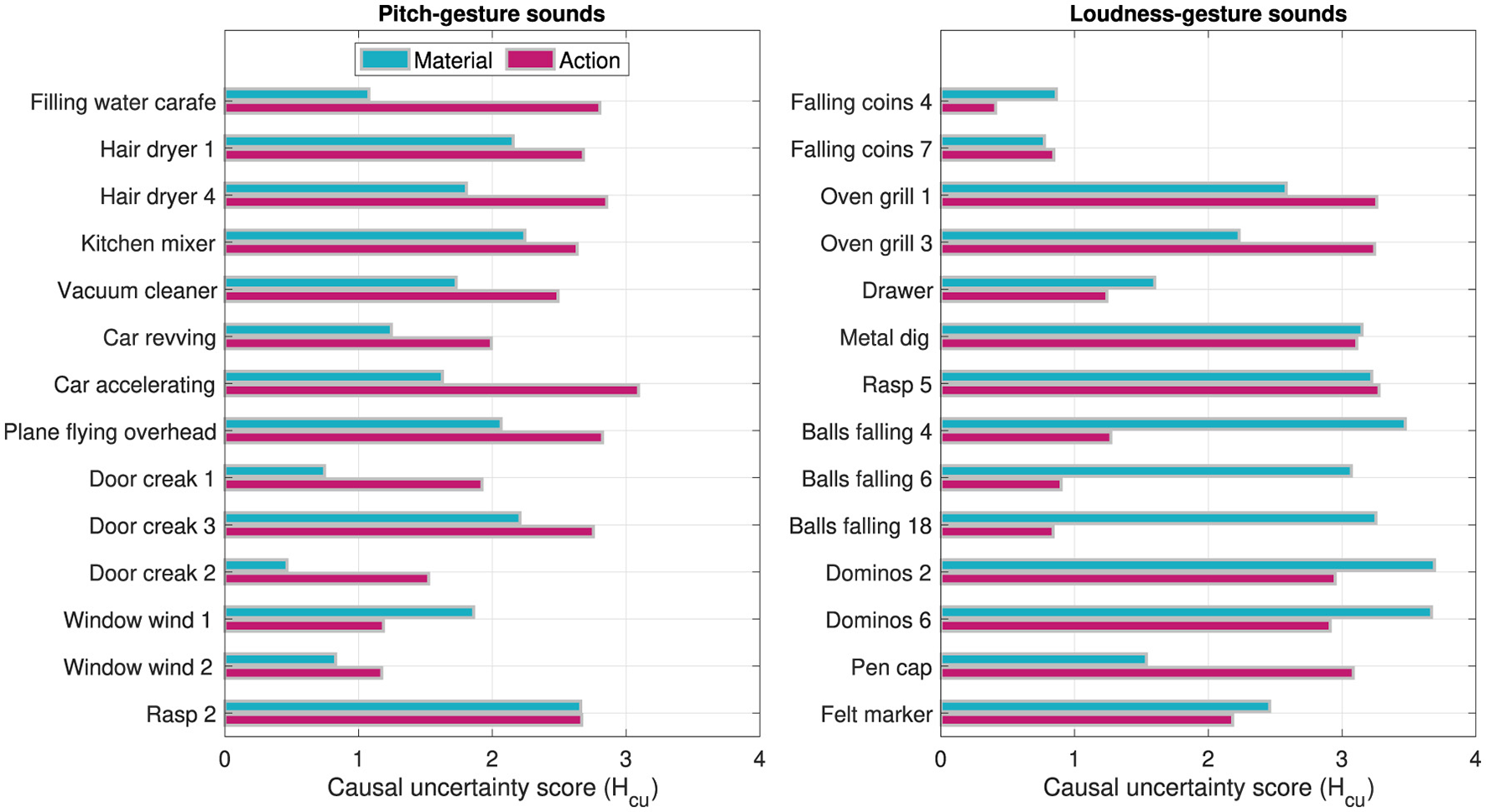 The relevance of object and action as two common, basic categories has been confirmed across a range of perceptual studies focusing on the factors underlying the identification of environmental sounds (e.g., Ballas, 1993; Lemaitre et al., 2010; Houix et al., 2012). Studies have employed verbal description in pairs of nouns and verbs for objects and actions, respectively (Ballas, 1993; Lemaitre et al., 2010), while others have described objects also in terms underlying materials (Gaver, 1993; Giordano and McAdams, 2006; Houix et al., 2012; Lemaitre and Heller, 2012; Hjortkjær and McAdams, 2016; Lemaitre et al., 2018). Furthermore, Ballas (1993) established that the accuracy for correct identifications and the associated response time depends on factors such as familiarity, ecological frequency, and the identifiability (rated confidence in knowing the source/cause).