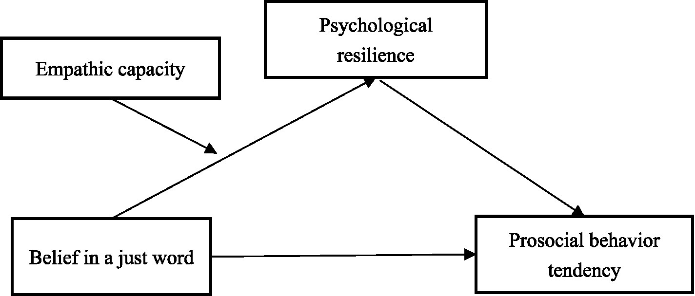 The context of Chinese university students provides a unique and important setting for examining these relationships. First, Chinese university students face distinct pressures and challenges, including intense academic competition, career uncertainty, and the need to balance traditional values with modern aspirations (An et al., 2024). Second, they represent a generation that has grown up during China’s rapid social and economic transformation, potentially influencing their beliefs about justice and their approach to prosocial behavior (Chobthamkit et al., 2024). Despite the growing body of research on the relationship between BJW and prosocial behavior, there are still significant gaps in our understanding of this topic within this specific context. First, the role of psychological resilience as a potential mediator in the relationship between BJW and prosocial behavior has not been thoroughly investigated. Psychological resilience, which refers to an individual’s ability to adapt and cope with adversity and stress (Fletcher and Sarkar, 2013), has been shown to be positively associated with prosocial behavior (Datu and Restubog, 2020; Kındap-Tepe and Aktaş, 2021). This is particularly relevant for Chinese university students who must navigate significant academic and social pressures while maintaining their psychological well-being. Second, the moderating role of empathic capacity in the relationship between BJW and prosocial behavior has not been adequately explored. Empathic capacity, which involves the ability to understand and share the emotions of others, has been consistently linked to prosocial behavior (Decety et al., 2016; Van der Graaff et al., 2018). Understanding these relationships in the Chinese university context is crucial for developing culturally appropriate interventions to promote prosocial behavior and psychological well-being among this population.