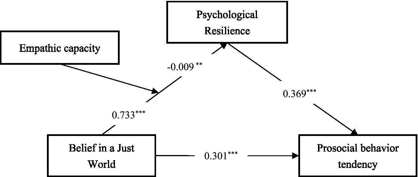Therefore, we propose: Hypothesis 4: The indirect effect of belief in a just world on prosocial behavior tendency through psychological resilience is moderated by empathic capacity, with the resource conversion process being more efficient when empathic capacity is higher.